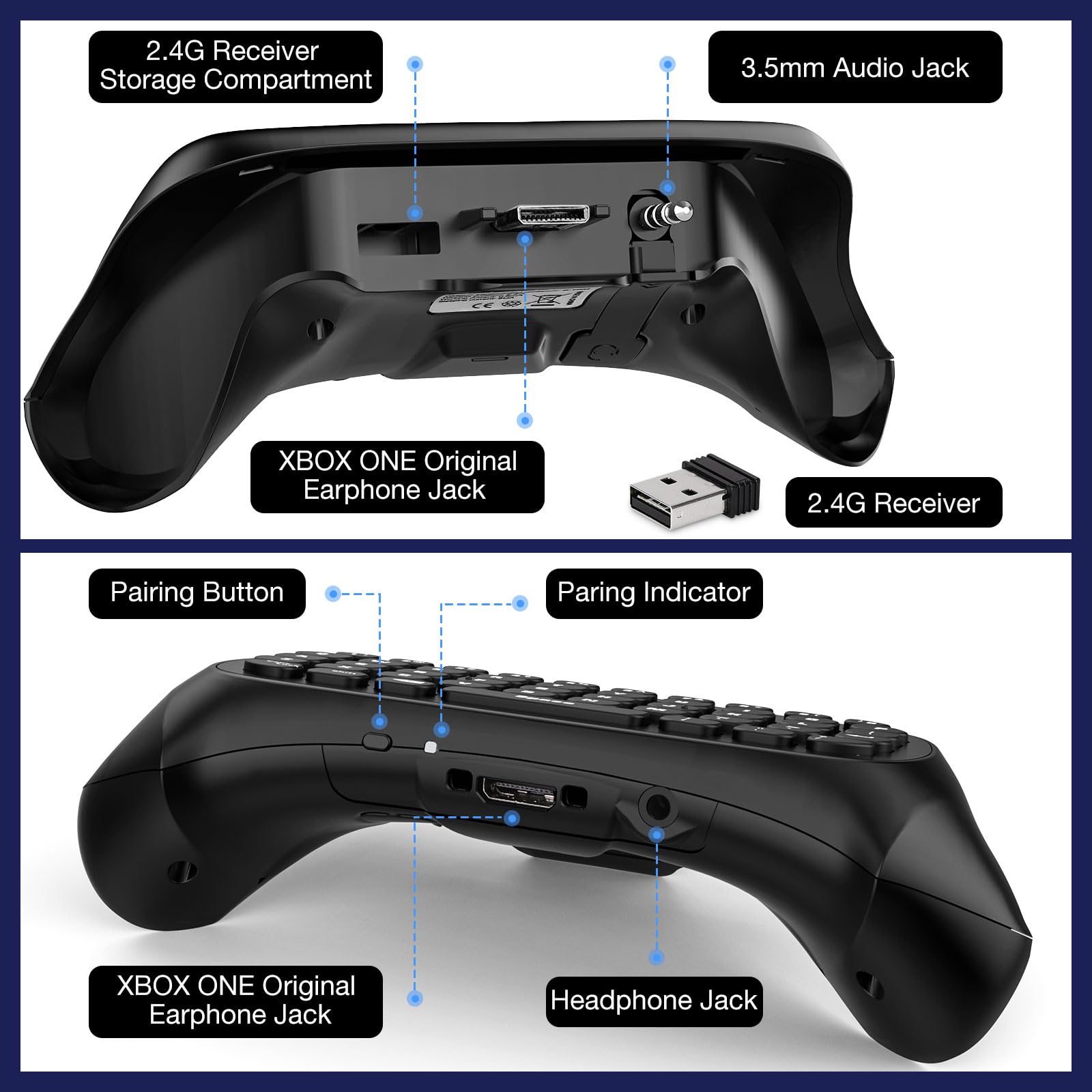 ["COMPATIBILITY - Fits perfectly with any version of the Xbox One controller, including Xbox One S, Xbox One Elite, Xbox Series X, Xbox Series S.","QUICK INPUT - Easy to edit text, input fixed code, reply to messages and emails. Ideal for group chat while gaming. 2.4G wireless protocol (receiver) for data transmission.","GREEN BACKLIGHTING - The keyboard is powered directly from the Xbox One wireless controller. Simply slide this product onto the Xbox One controller and press the \"Xbox\" button, the keyboard backlight will light up. If the keyboard is not working within 10 seconds, the backlight will automatically switch to power saving mode.","ENJOY THE SOUND - Suitable for any 3.5mm audio device jack. Connect headphones and enjoy the game.","COMFORTABLE FEEL - Clear letter keys provide you with a comfortable typing experience. A great accessory you won't want to miss while gaming."]
