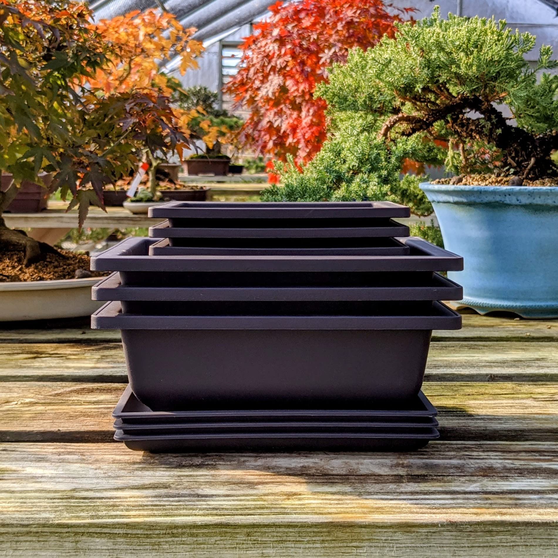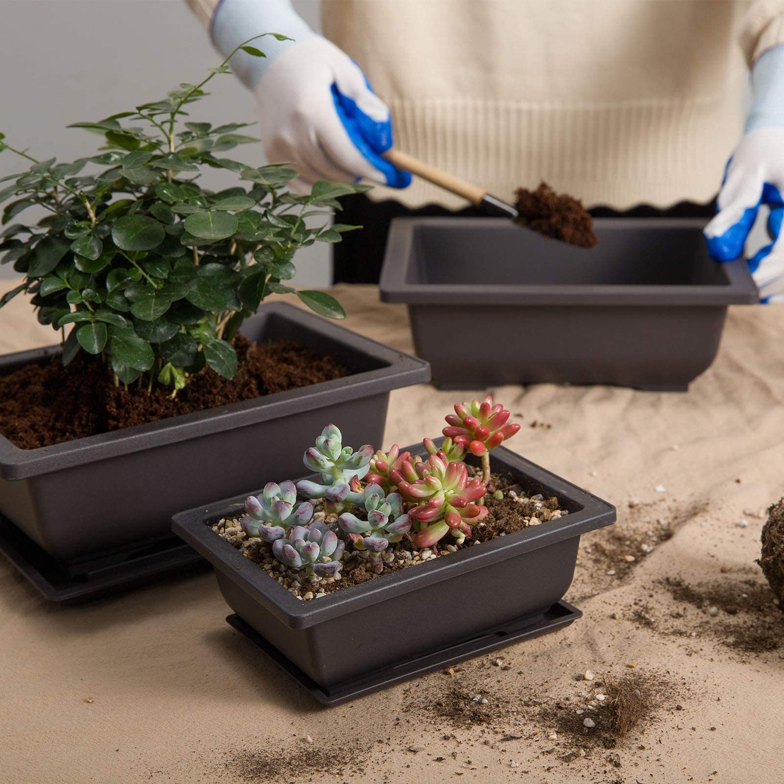 ["HIGH QUALITY - The Bonsai Training Pot is made of premium plastic, durable, environmentally friendly, and allows you to reuse it for multiple seasons.", "UNIQUE BOTTOM DESIGN - Built-in drainage holes, the Bonsai pot with raised pot feet ensures proper airflow and water drainage to promote plant growth. The attached tray can store water drained from the Bonsai pot to keep your area clean.", "SIZE & PACKAGING - The Bonsai tray consists of a pot with drainage holes and a tray. Size with tray (LxWxH): 6.3x4.7x2.4 inches. Package includes: 6 flower pots (Bonsai Pot) and 6 trays.", "WIDELY USED - These Bonsai training pots are widely used on windowsills, patios, gardens, porches, or other indoor-outdoor occasions. Perfect for training Bonsai trees, succulents, cactus, or other plants.", "RECTANGULAR DESIGN - The Bonsai Training Pots with rectangular design can provide a large space for your plant growth. It can be easily blended and matched in any environment and can be used as a creative decoration to save space indoors."]