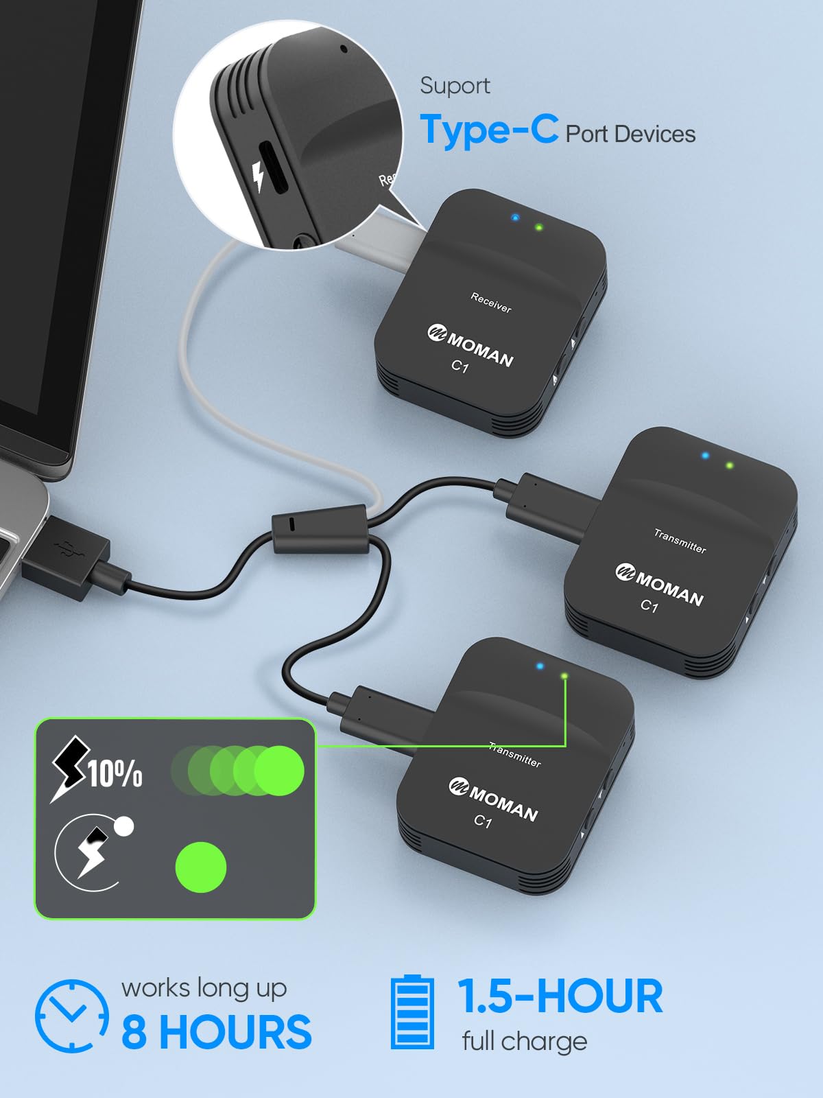 Intuitive LED indicators and 8 hours of battery life: With a built-in 400mAh lithium battery, the wireless MOMAN C1X microphone works for up to 8 hours after just 1.5 hours of full charging. It supports charging while recording as well as simultaneous charging of 2 TX and RX. The LED indicators on TX and RX provide information on operating conditions such as power, charging, pairing, and low battery.