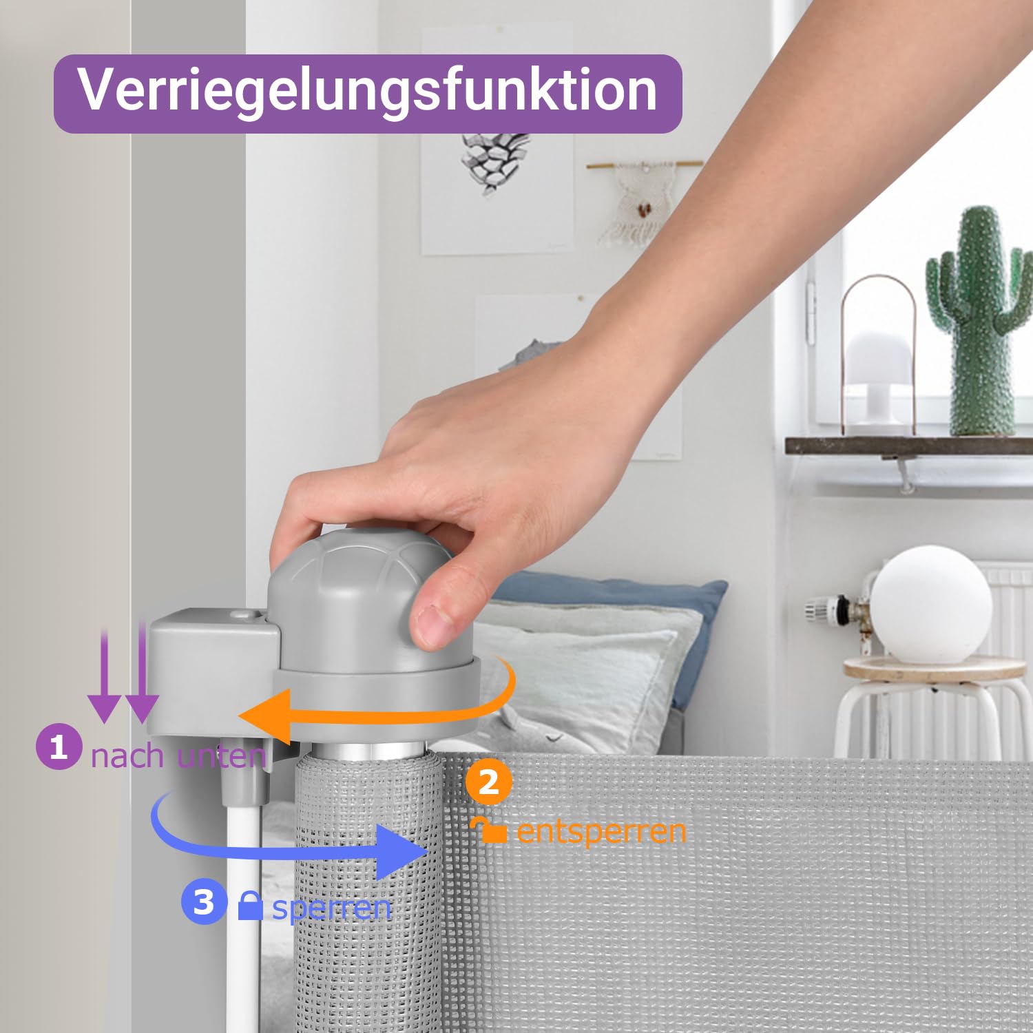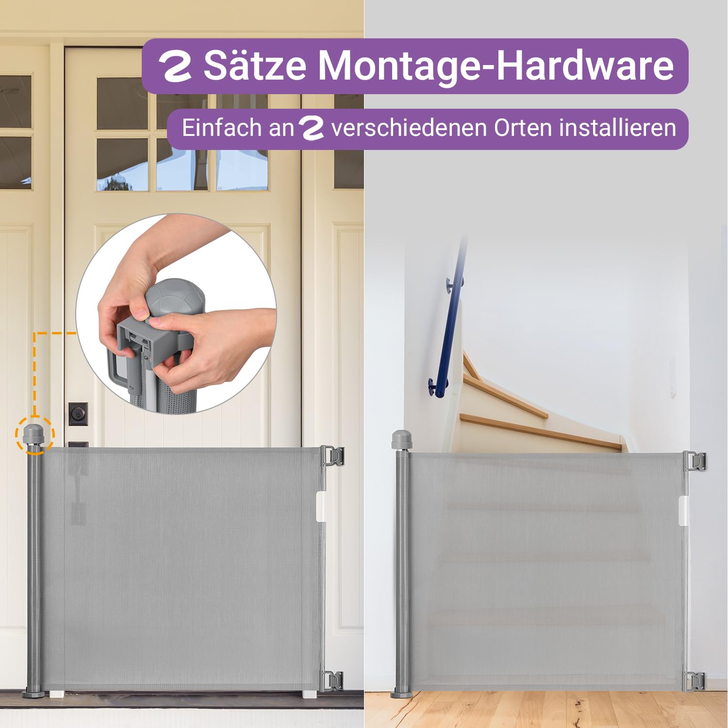 ["Product details: This baby gate for outdoor use has a width of up to 140 cm and a height of 86 cm. It includes all components for easy installation: screws, catch/lock fastening, additional wall spacers for skirting boards, installation instructions. Note: Do not install at the top of the stairs.","One-handed operation: The one-hand operation allows you to open and close while holding your child, easy 2-step operation: 1. Press, turn and release the button; 2. Pull the handle to extend the gate. When the handle is released, the gate automatically locks the locking mechanism.","Expandable design: A versatile safety solution for living areas, allowing for easy use in high traffic areas without the hassle of disassembly. These stair safety gates can adjust to fit any door width up to 140 cm. It is convenient and space-saving.","Easy to relocate: The stair gate extension includes two sets of mounting hardware for use in more than one location. You could easily move the gate from your living room to the stairs or to another location using clip-on & clip-off.","Perfect for children and pets: The outdoor baby gate functions as both a baby gate and a pet gate to block the way for babies and pets. It provides safety and protection throughout the house. This retractable dog gate is suitable for babies aged 6-24 months. For pets weighing 10 to 40 pounds."]