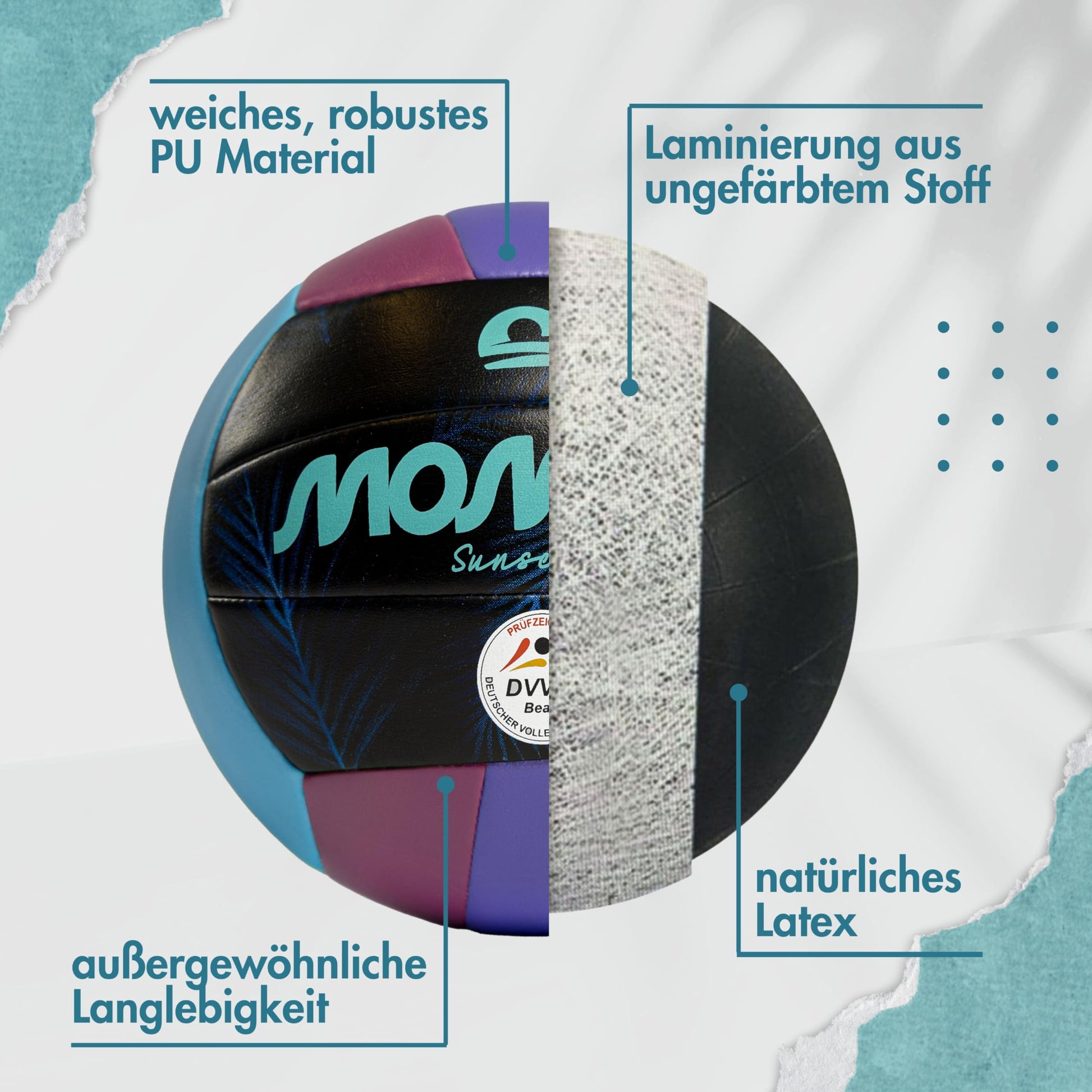 "This beach gem provides fun - tested and certified by the German Volleyball Federation, rough PU surface and exciting design for long-lasting Beach volleyball fun"