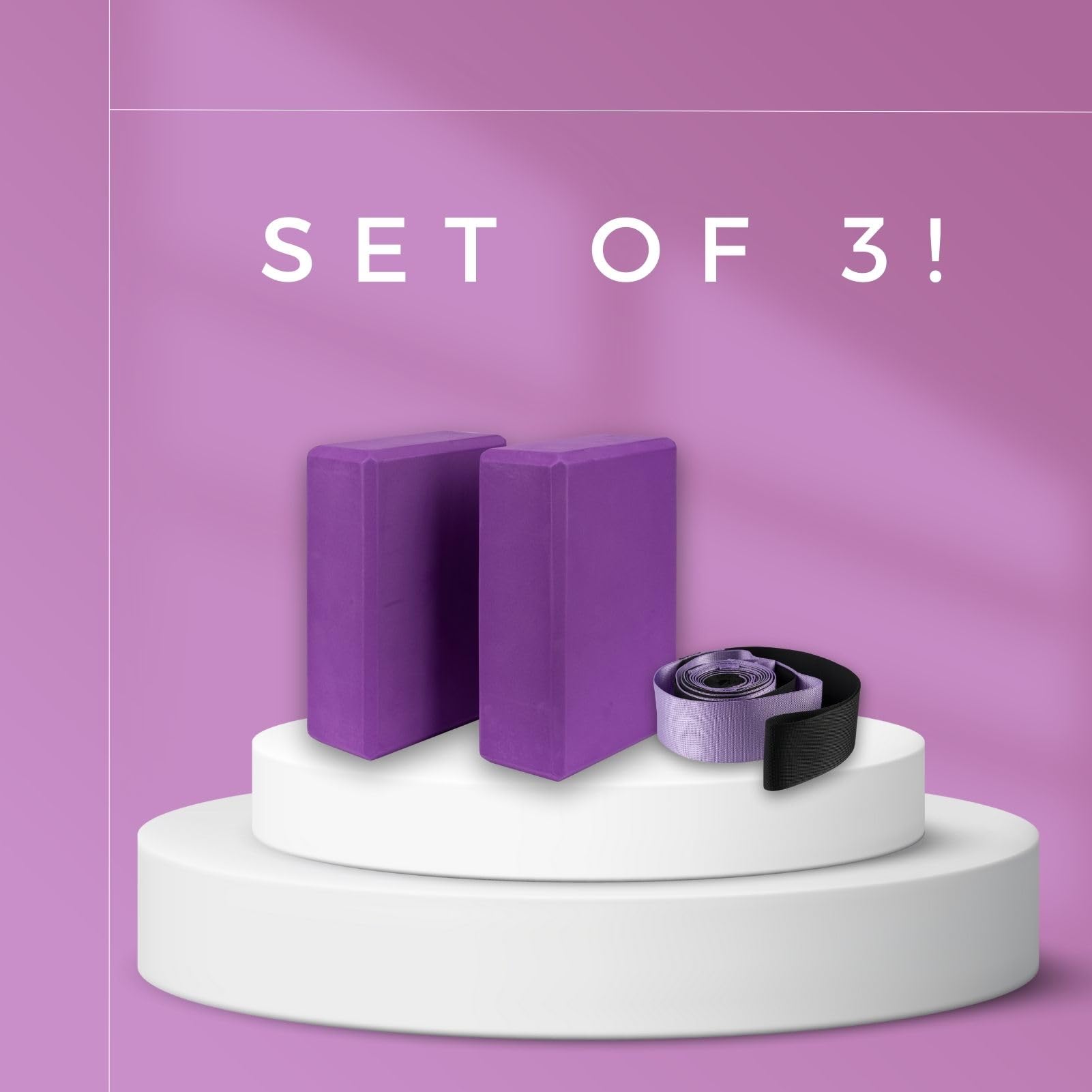 The set includes two purple yoga blocks and a matching purple exercise band. It is a great gift for any Yogi, regardless of skill level!"