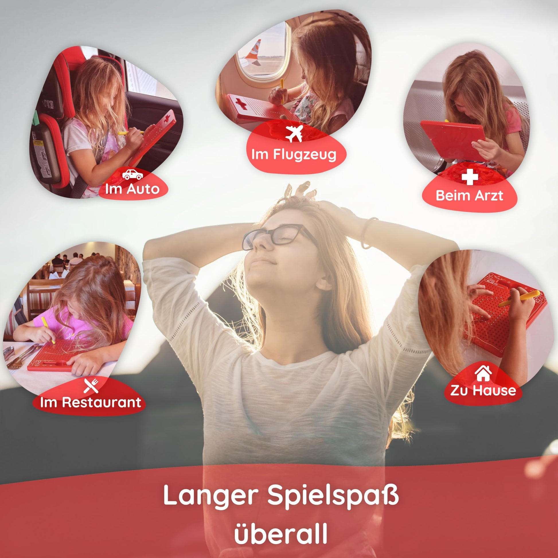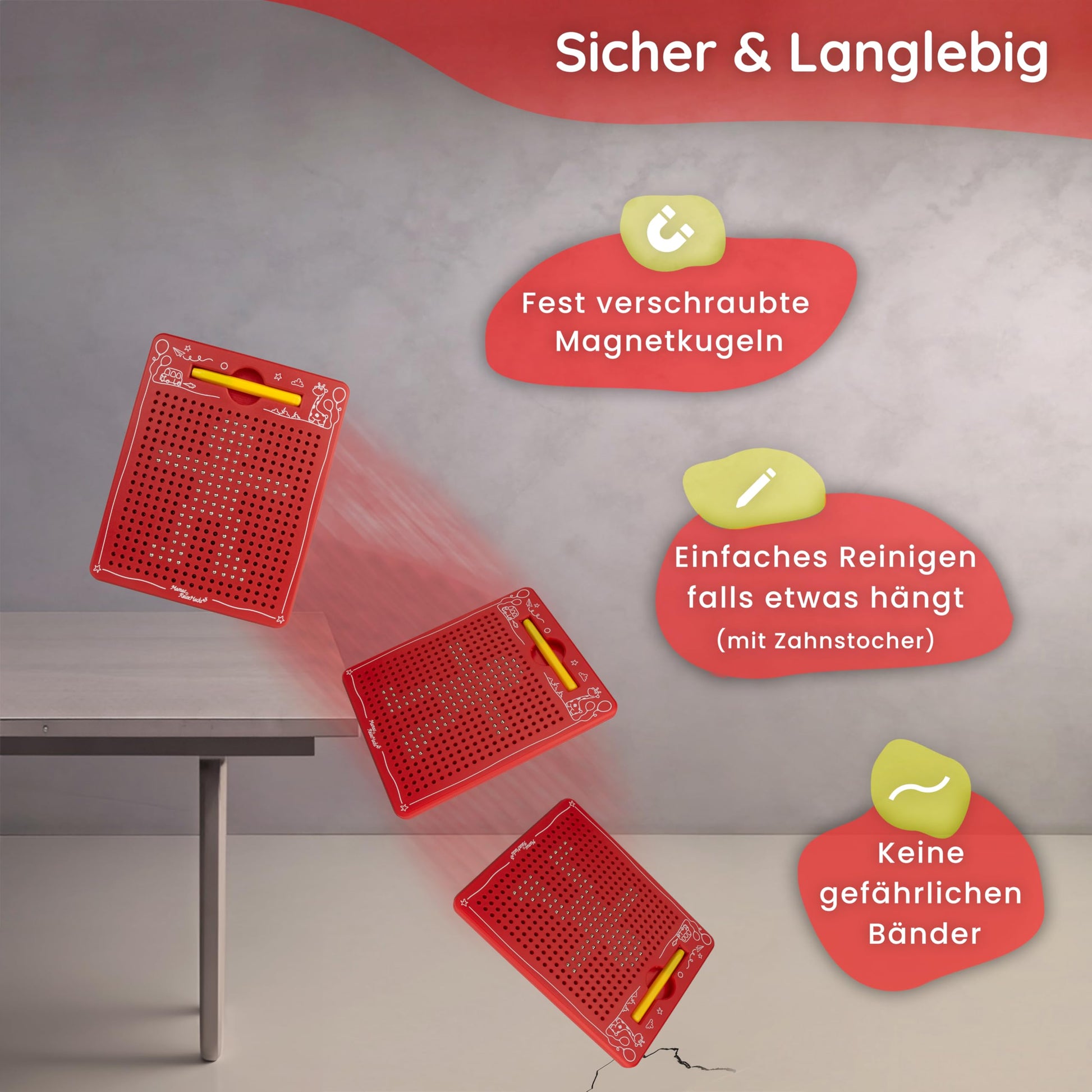 ["Are you tired of crowded luggage? Other magnetic drawing boards claim to be travel-friendly, but they're huge. Our practical Reisemat fits even in your handbag (21.5 x 17.5 x 1.2 cm).", "Keep your child entertained - On long car rides, on a plane, or at a restaurant, the fascination of the magnets will keep your child busy longer. With a gentle click, the magnetic pen moves the balls up or down.", "Built to last - Even if the sturdy magnetic board for kids falls, the balls are securely fastened. The signal yellow pen is easy to see and has no dangerous cords to worry about.", "Did you know that this magical magnetic game promotes more than just creativity and endurance? Your child learns to hold a pen playfully and trains fine motor skills for writing. This strengthens them for a successful start in school.", "Seeking ultimate family time, fun, and bonding. With our carefully selected templates on the drawing board (+ more for download), your child will have hours of fun. Get ready for the most relaxing journey of your life!"]