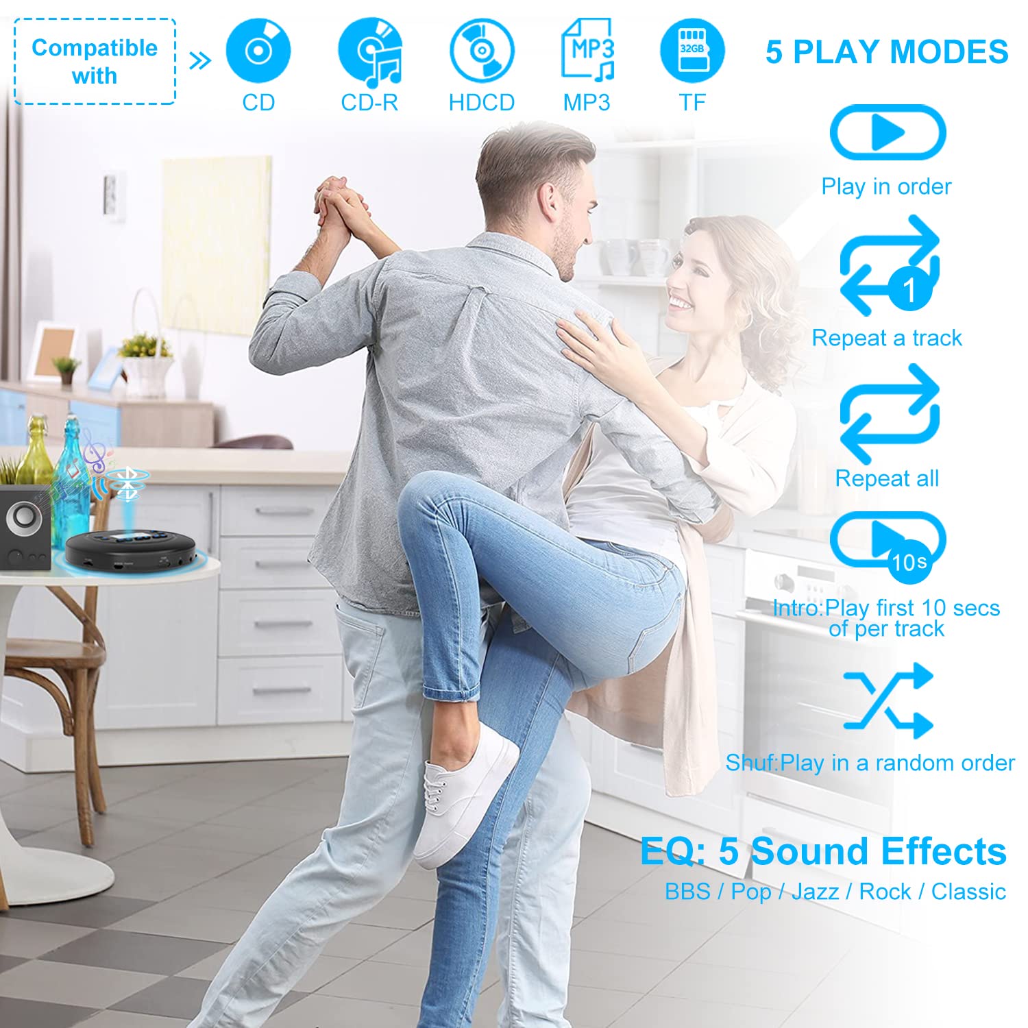 ["Bluetooth CD Player: This portable CD player can work with Bluetooth headphones, wired headphones, and Bluetooth speakers. Bluetooth 5.0 supports up to 20 feet transmission. It also has two headphone jacks for wired headphones. A great CD player for home and travel.","Rechargeable and portable: Our CD player with Bluetooth has a built-in battery. It can be charged with a power adapter/car charger/power bank. This rechargeable portable CD player supports up to 15 hours of playback after a full charge. Our car CD player comes with a portable carrying case for easy storage and carrying.","Easy to use: Our Discman CD player features a large LCD display with backlight for easy viewing at night. The display can show the title name and remaining battery. The buttons are easier to use for seniors. Designed with 2 headphone jacks for music sharing. A mini MP3 CD player is suitable for kids, elderly, adults.","Anti-Skip & Resume Function: The advanced anti-skip function ensures that the CD player continues playing even during shocks, bumps, or rides on bumpy roads. Additionally, our portable CD player with Bluetooth can resume the title and start where you left off, you won't miss anything. It can also fast forward and rewind titles and repeat specific titles A-B.","Multifunctional CD player: This CD player has a micro-SD card slot, you can store music files in MP3 format on an SD card and play them from this CD player. Supported disc formats: CD, MP3, CD-R, CD-RW, and HDCD. Music format: CD-DA, MP3, WMA. NOTE: This portable CD player does not have built-in speakers, you need to use it with headphones or an external speaker"]