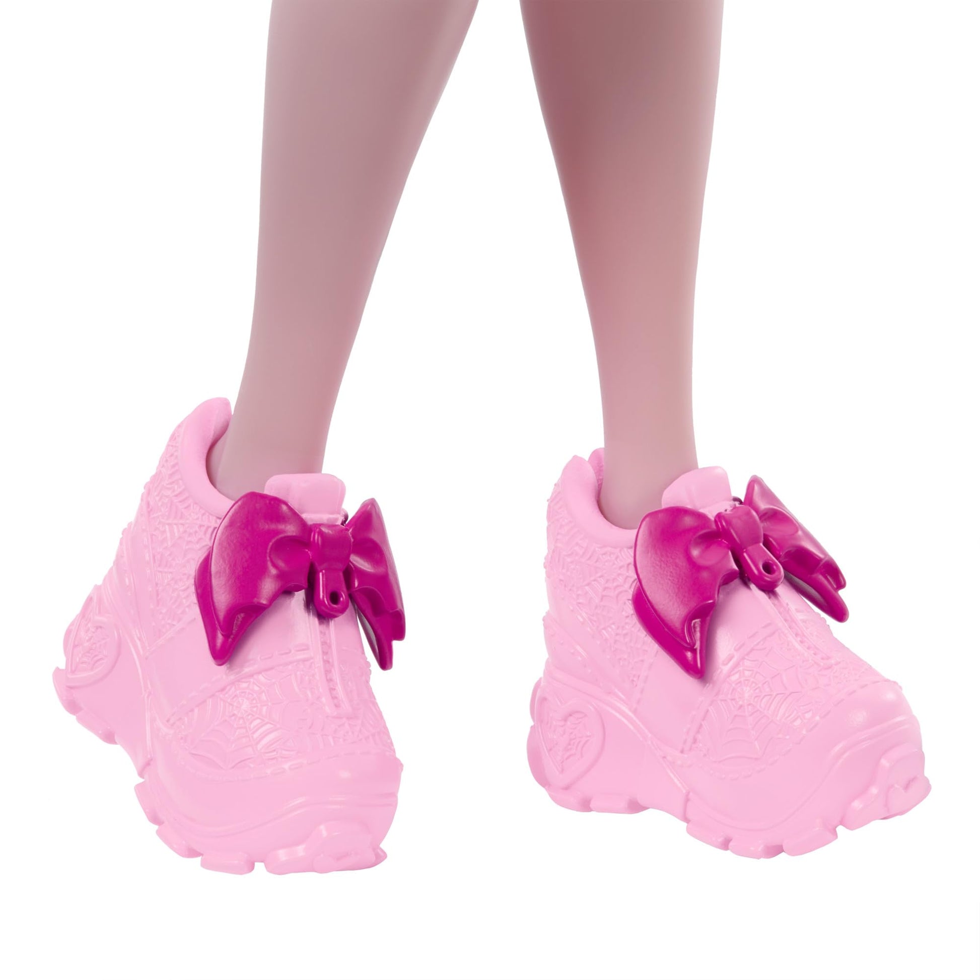 She wears a pink heart dress with a spiderweb jacket and matching beret. She also has a film club varsity jacket to look stunning in club photos in the yearbook!