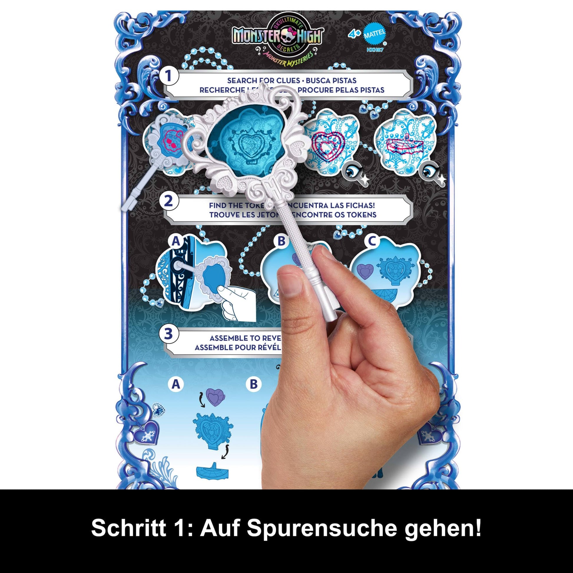 ["With this Skulltimate Secrets: Monster Mysteries wardrobe set, the secrets behind the gates of Monster High can be discovered! The set includes an Abbey Bominable doll as well as chillingly cool clothing and accessories.","Abbey Bominable needs to put on a show, but she's nowhere to be found! To locate her whereabouts, clues must be searched for, with over 19 surprises to discover in 3 spooky-fun steps: solve, unlock, reveal.","Step one? Use the magnifying glass key to reveal the symbols on the treasure map. When kids unlock the wardrobe doors, they'll find pendants in the surprises that match the symbols on the map!","Behind the doors, kids will find not only clothing and accessories, but also additional clues in the form of pendants! Assemble the 3 pendants to receive a single mysterious talisman.","Insert the talisman into the bottom of the wardrobe and then pull it up like a zipper to reveal the Abbey Bominable doll in all her gruesomely glacial glory! The reveal can be repeated for endless fun.","Now that Abbey Bominable and her popstar fashion have been found, it's time to get ready! With over 125 mix-and-match possibilities, the outfit behind the scenes can be changed quite frequently!","Clever unboxing fun is the best kind of gift! More terrifyingly fashionable Monster High dolls can be found throughout the Skulltimate Secrets: Monster Mysteries collection."]