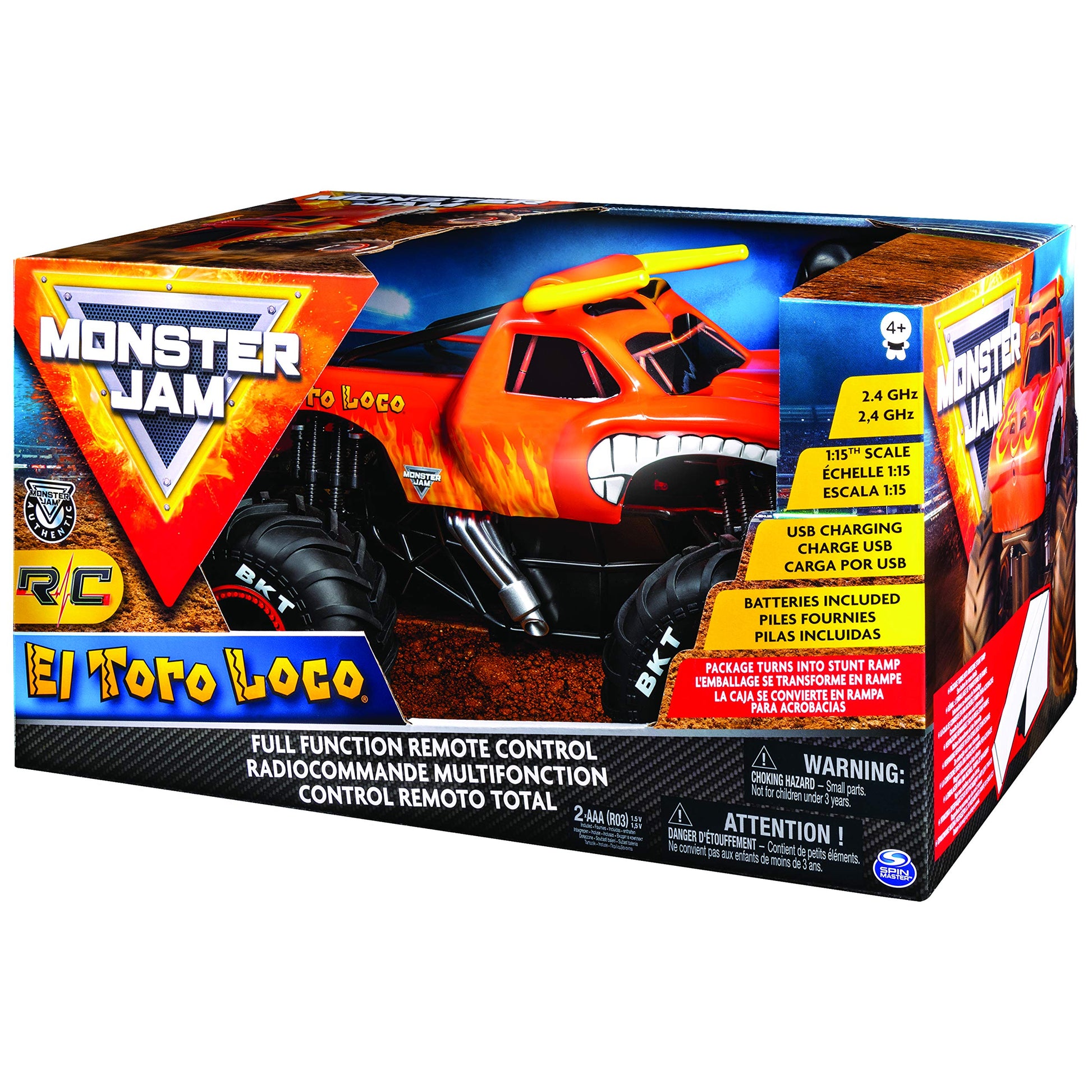 ["Ready to race: Your official Monster Jam El Toro Loco is ready for explosive action straight out of the box. Simply flip the switch and you're ready to go, set, Monster Jam!! !", "Packaging transforms into a ramp: Hit monster air straight out of the packaging. Use the included instructions to transform the packaging into a monster-sized ramp!", "Official EL Toro Loco: Your 1:15 scale El Toro Loco is an official Monster Jam truck. It comes complete with official sponsors BKT Tires and a similar chassis look, making your monster truck look like the real deal", "Fully functional RC: 2.4 GHz frequency provides a range of up to 250 feet and allows you to race up to 6 Monster Jam Trucks simultaneously! A dual-joystick controller turns this monster truck into a fully functional RC; forward/backward, left/right steering. When you're done, use the included USB cable to recharge your El Toro Loco. The brand new 1:15 scale El Toro Loco RC toy is the ultimate gift for kids and Monster Jam fans. Order yours today!"]