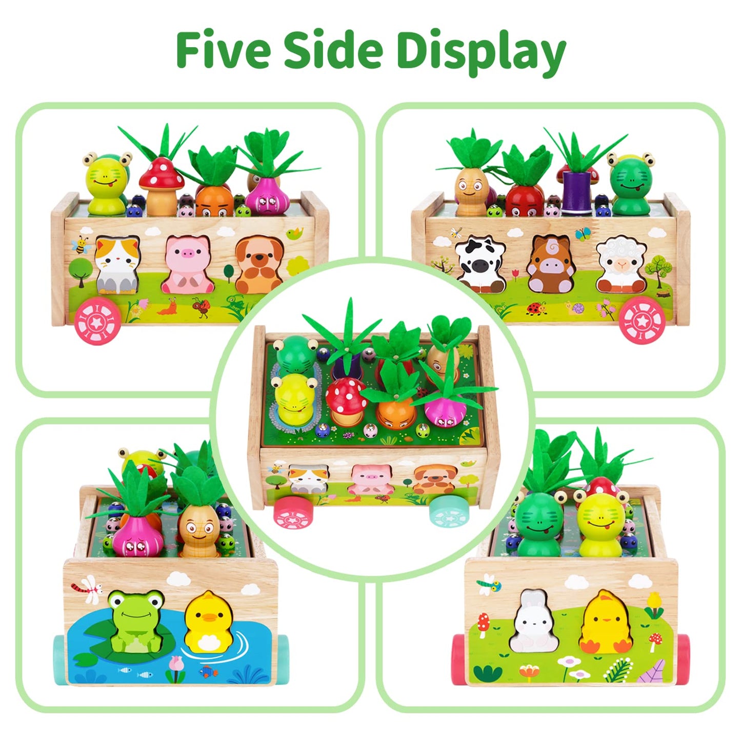 ["Montessori educational toy for early childhood development"] This wooden sorting toy includes 6 different vegetables and 10 farm animals, 6 cute worms, 1 boy driving a car, 1 woodpecker, 2 frogs, and a car with an additional pentagonal wagon with body patterns. Carrots, onions, and peanuts are all added with cute expressions. Toddlers can recognize different shapes and colors to classify and match them. Toddlers aged 1-3 will love it very much.