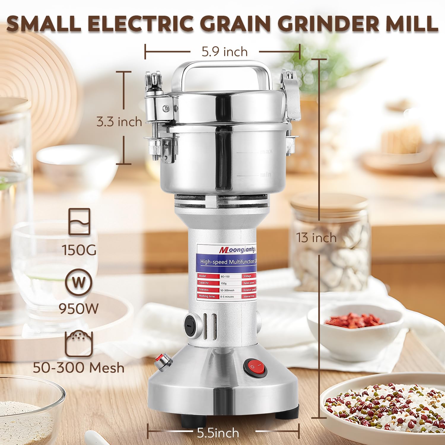 Moongiantgo Electric Grain Mill 150g, 950W Spice Grinder made of 430 Stainless Steel Commercial Powder Machine High Speed Mill for Grains, Spices, Herbs, Coffee, Corn with Overload Protection