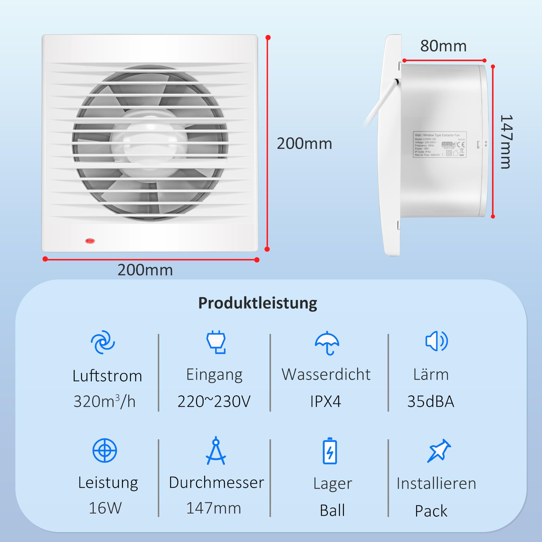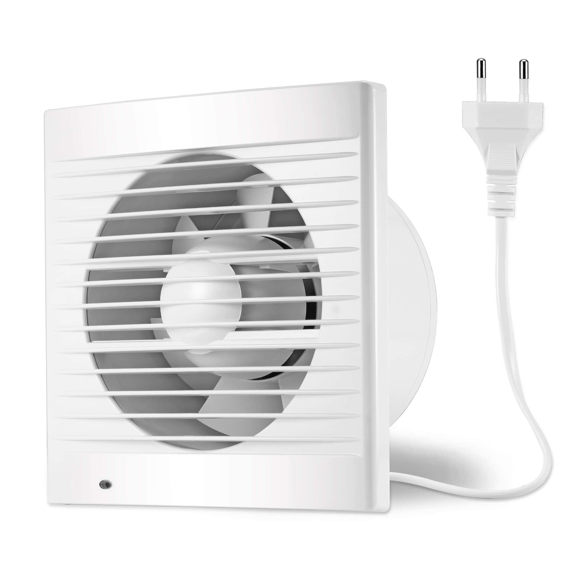 ["【High Performance】- Diameter: 150 mm; Voltage/Frequency: 220-230 V/50 Hz; Airflow: 320 m³/h; Current: 0.17 Amps; Power: 18 W; Operating humidity: <80%; Noise: 35 dB; Applicable area: 8-12㎡; Operating temperature: -20℃ to 60℃.","【EU Plug】- Standard 2-round-pin EU plug, we promise high-quality plugs with EU standard. Cable length 1m. Plug & play into your socket.","【Wide Application】- The bathroom fan is designed for anywhere with a small square needing ventilation or odor removal. It can be used in bathrooms, living rooms, bedrooms, kitchens, offices, and any other areas requiring continuous or regular ventilation. Please measure correctly before purchasing according to the picture.","【High Quality】- The smooth plate and fan blades are made of high-quality, durable ABS plastic, effectively protecting the motor for better performance; Built-in backflow damper can prevent wind backflow; High performance and long lifespan.","【Easy to Install】- This wall fan can be easily installed on a window or wall. Package includes 1 x bag of installation screws and nuts."]