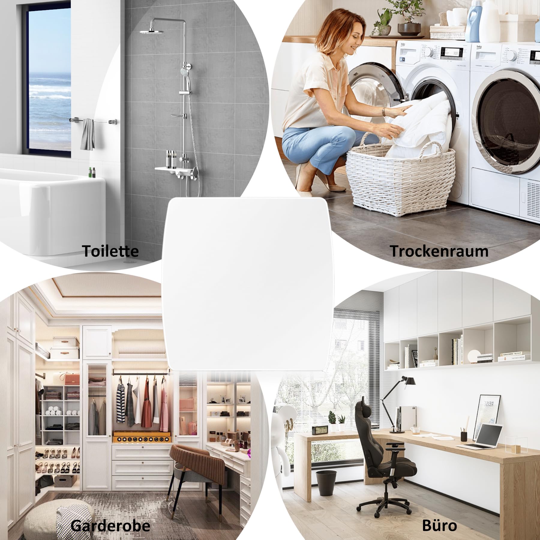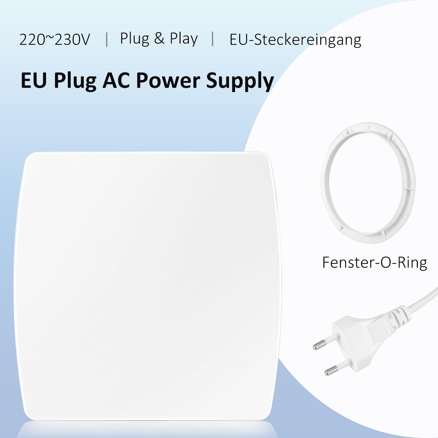 ["Smooth panel: The entire fan body is made of ABS material. With the smooth mirror panel, it fits the modern, simple, and elegant industrial living style.", "Ball bearing and EU plug: The mini window fan selects a ball bearing with a full copper coil, which works better in the bathroom environment. Power: 18W; Airflow: 240m³/h; Operating voltage: 220~230 V; Noise: <36dB; Plug type: EU plug (2 round pins); Cable length: 1 meter (3.3 feet).", "Back damper & window ring: Enhanced the fan with a back damper that blocks the air backflow indoors. The plastic adapter ring is equipped with a screw buckle for easy installation and maintenance. You can install the ring first and then adjust the fan.", "Lightweight and mini size: Replace the old ceiling fan in a box size with the lightweight mini fan, even a girl can install it by herself to build a small ventilation system (Plug & Play, no wiring required). It is always recommended to install it about 2.3 m above the ground to optimize the ventilation effect.", "Widely used and premium service: The window fan from Moonjor is commonly used in small bathrooms, toilets, garages, basements, galleries, children's rooms, offices, basements, storage rooms, grow tents, etc. (3 ~ 5 m³ small space, air exchange for 3 ~ 4 times a day)"]