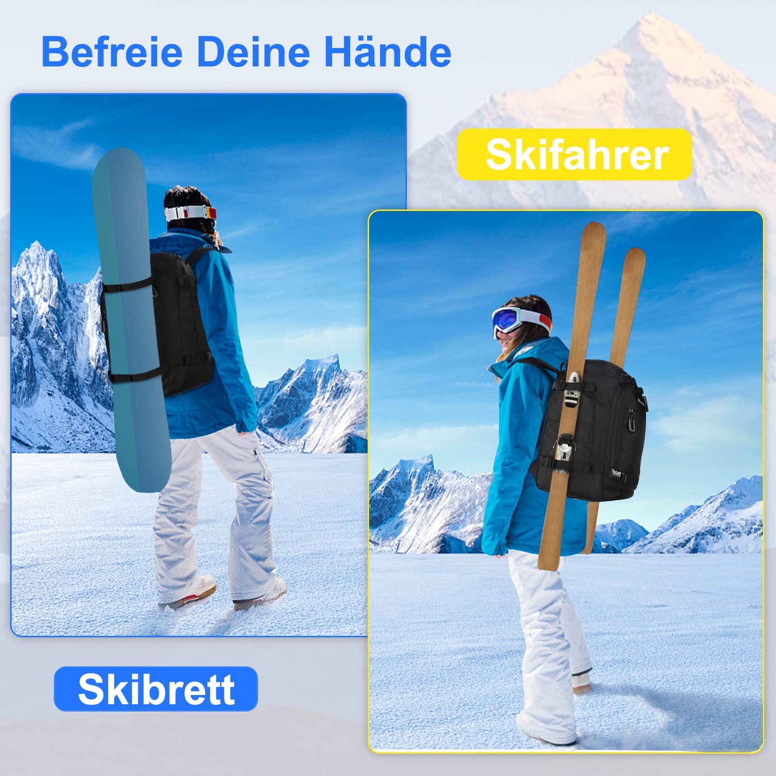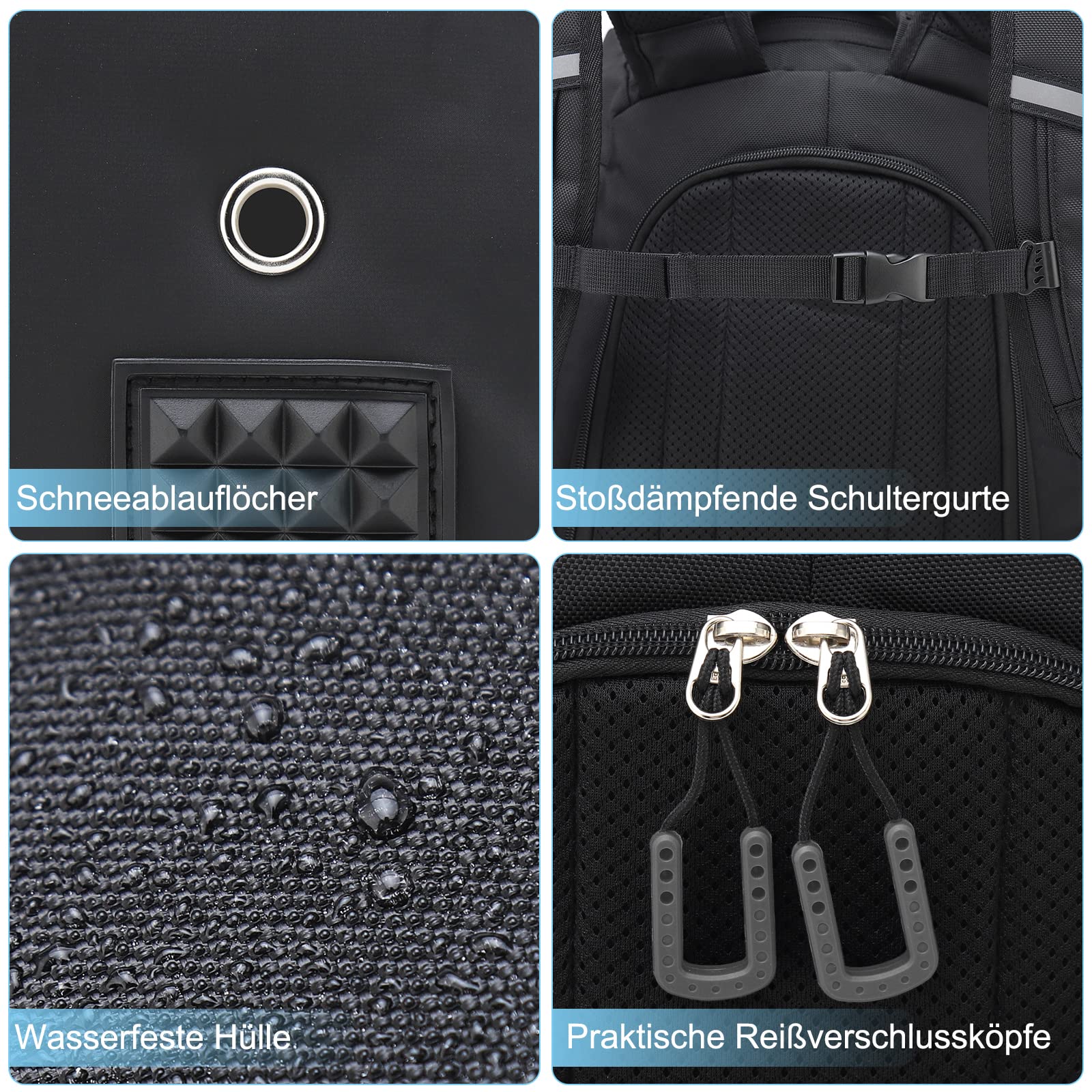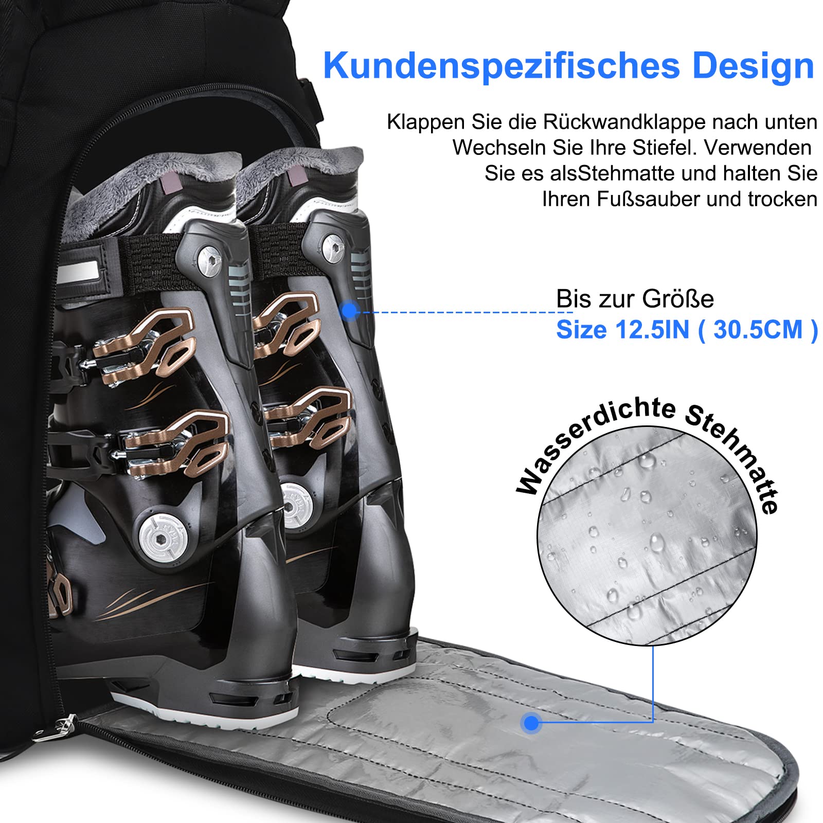 ["High Quality Material: The ski boot bag is made of custom-made 1680D nylon, the fabric is super abrasion-resistant and tear-resistant, the surface of the bag is coated with high-quality waterproof material, the padding and shoulder straps are made of moderately soft material, which greatly improves comfort, furthermore, the ski boot bag has a waterproof and cold-resistant foil-reinforced bottom for barefoot standing","Improved Design: We have added snow drainage holes, shock-absorbing shoulder straps, practical zipper heads to the base of traditional ski boot bags. In addition, drawing on years of experience in designing ski accessories, we have equipped our ski bags with reflective stripes on the shoulder straps so that they can make you more visible in fog or dusk. The reflective strip on the front can make you more conspicuous and increase safety","LARGE CAPACITY: With a capacity of 50 liters, this backpack can hold almost all the ski equipment you need for cross-country skiing, touring, or alpine skiing, such as ski boots, ski helmet, change of clothes, ski gloves, ski goggles, and more","Versatile Storage: Enjoy perfect organization in a variety of individual storage compartments. You can easily store your ski boots in the main pocket. A helmet with ski goggles can be stored in the top of the bag. A large front pocket and a small inner pocket provide special compartments for clothing or gloves and other valuables. Two ski slots on both sides of the backpack to keep your items organized","SERVICE: If you encounter any questions about the product during the purchase or use process, please contact MoopGou customer service. We will contact you within 24 hours, solve your problem, and provide you with the best service. Suggestions are welcome"]