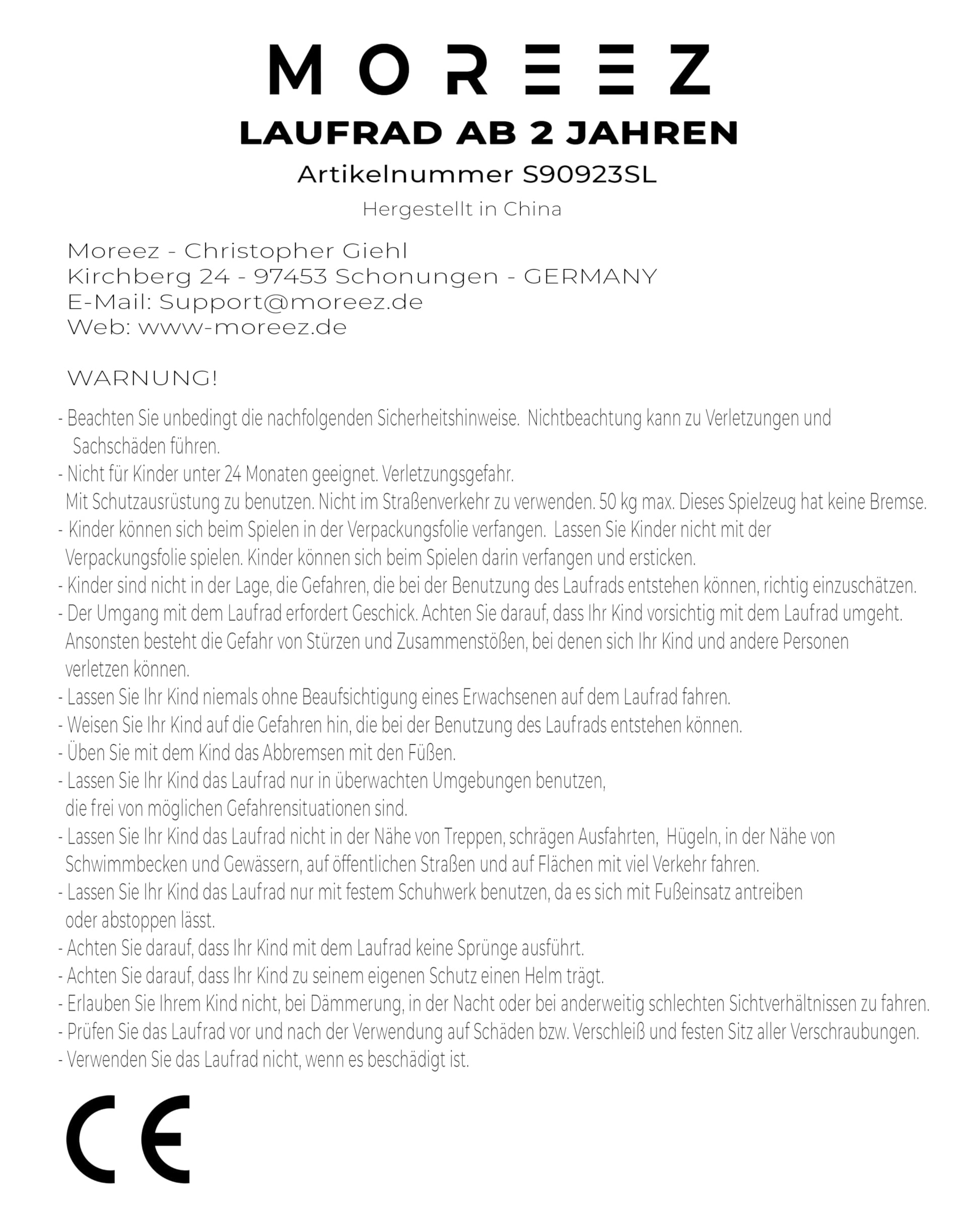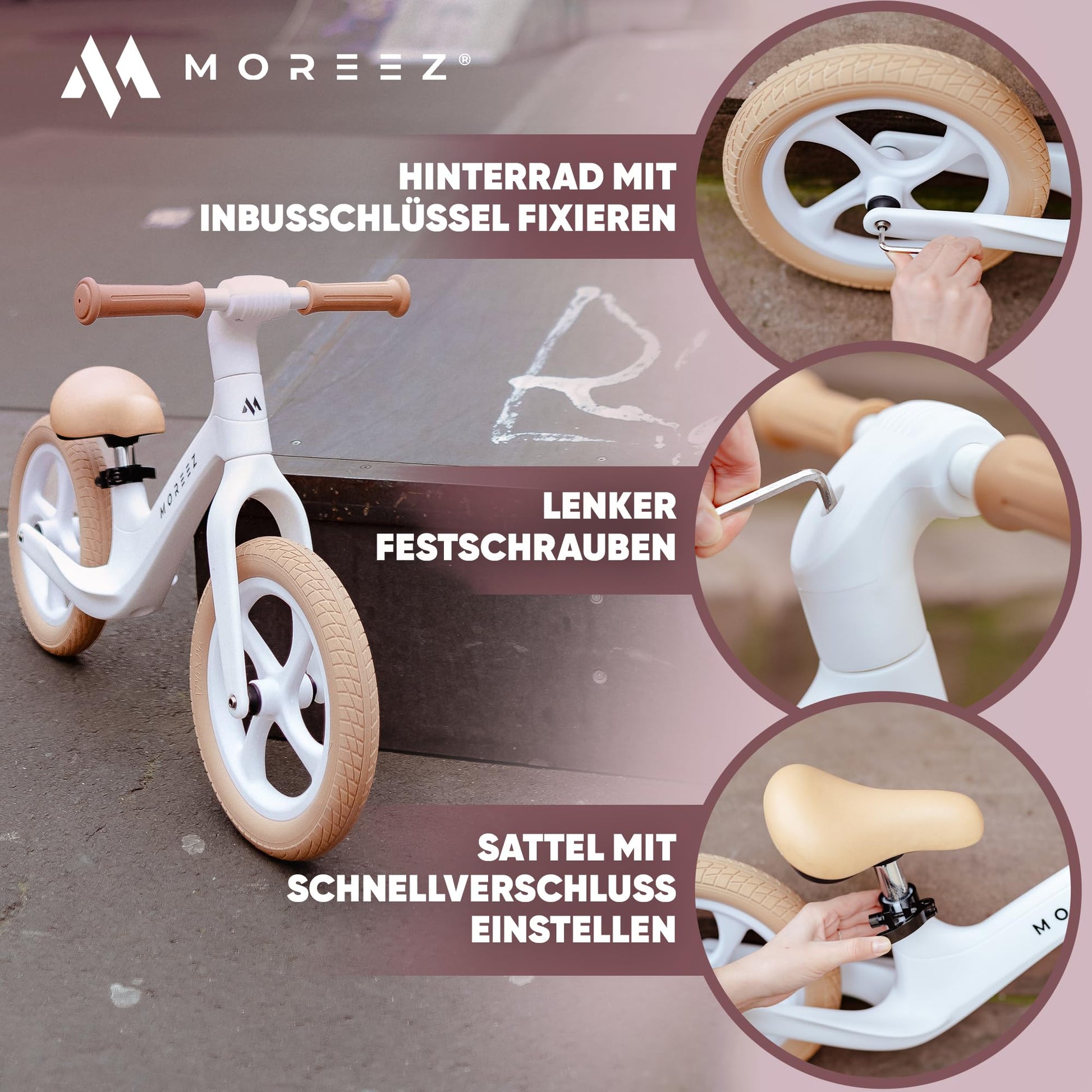 ["Handlebars restrictions can cause injuries. MOREEZ kids' bikes for 2-year-olds are equipped with a 360-degree swivel handlebar that lays flat on the ground in case of falls, preventing injuries to the stomach and chest – Maximum safety guaranteed. Also ideal as a balance bike for 3-year-olds!","The special handlebar allows maximum freedom of movement. This trains your child's body control much more effectively. Also essential is our Ergosport Saddle. The specially curved and rounded shape provides the best grip, enough room for the child's running movement, and promotes a healthy posture.","Safety and fun for little adventurers - With MOREEZ Balance Bikes, your child will experience exciting adventures everywhere. Whether in the park, playground, or on the way to school - our puncture-proof Strong-Grip Tires ensure safe riding, self-confidence, and reduced risk of falling.","An extensive list of features makes our balance bike the best choice. This includes the integrated footrest to improve balance, the low frame for comfortable mounting and dismounting, non-slip handlebar grips, stability, durability, lightweight, easy assembly, and an adjustable seat height.","Parents everywhere swear by MOREEZ balance bikes when it comes to teaching their children to ride. They are impressed by the quality, safety, and functionality. Join the family and give your child an unforgettable riding experience now."]
