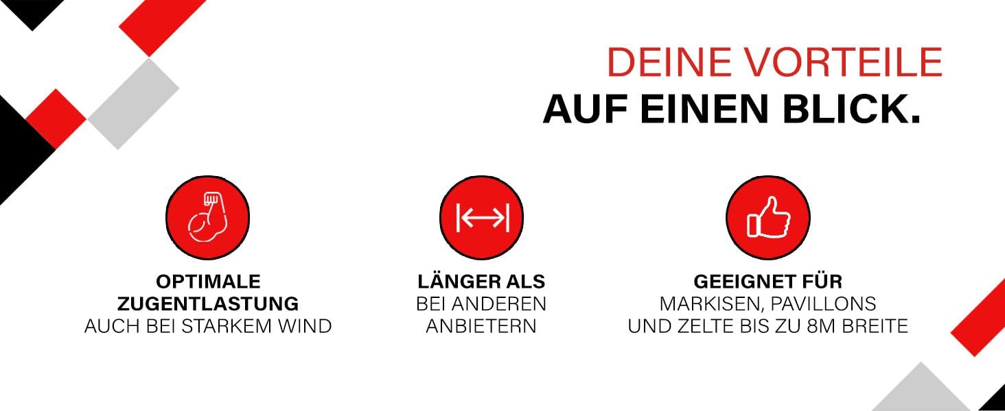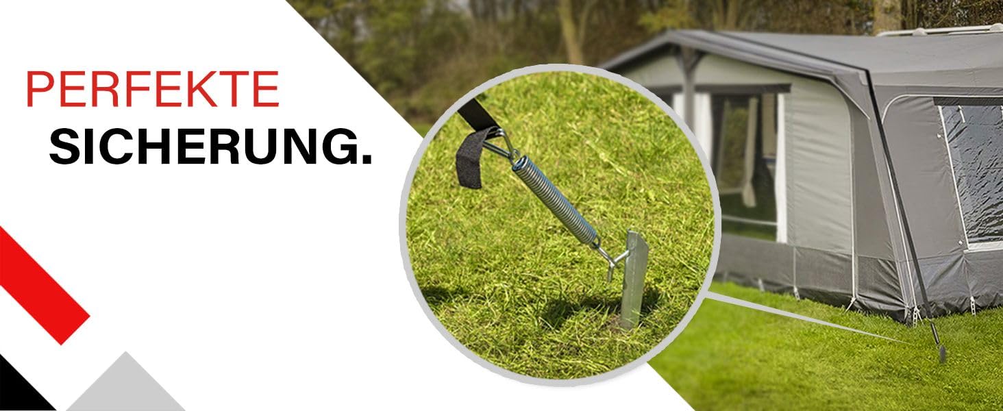 "Suitable for awnings / pavilions / tents up to 26 feet - 2 Extra long pegs 15 inches - 43ft strap length - 2 inches width - Tension spring 7.3 inches for optimal tension relief even in strong winds. Perfect security for awnings and canopies on trailers or motorhomes. Prevents awnings and protective tents from blowing away! This way your awning is perfectly secured! Awnings guyline set also suitable for pavilions, storage tents, sun sails or other mobile objects that need to be secured against storms and gusts of wind. Easy application: A detailed series of pictures show how the storm strap is threaded. Play it safe and attach your wind-sensitive items with a 43ft long storm line to prevent them from blowing away. A must-have for any camper who values a secure pitch for their awning. Installed in just a few minutes."