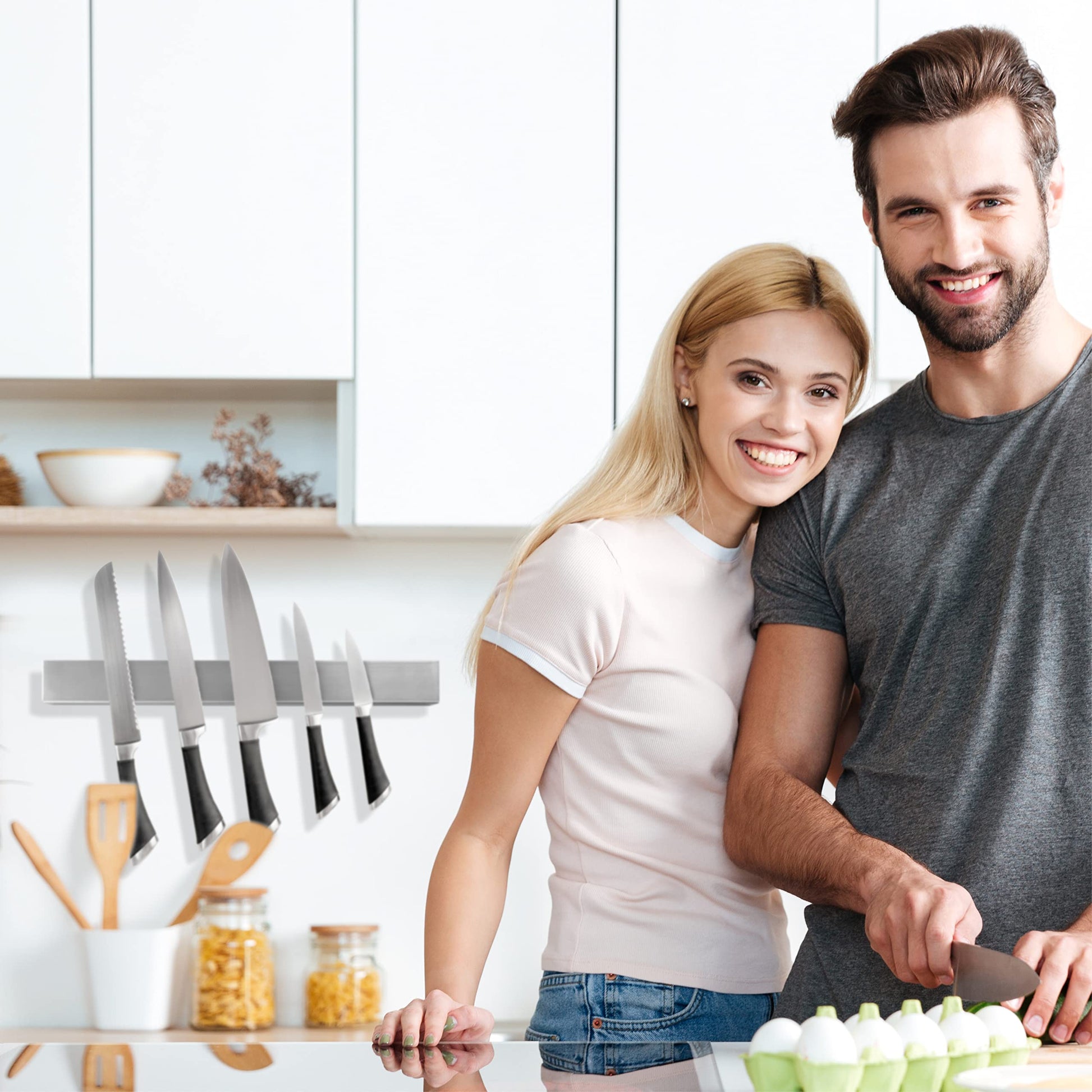 ["MEGA-POWER - Moritz & Moritz high-quality, extremely powerful magnetic knife holder, brushed stainless steel, rust-free, including screws and dowels, max. 11 lbs", "ORDERLY - Magnetic knife strip, 405x46x17 mm, for the clear attachment of metallic objects such as knives, kitchen utensils, scissors, tools", "RELIABLE - Extra strong magnetic strip for knives, also for heavier metallic objects, suitable for use in kitchen, workshop, garage, office, cellar", "SPACE-SAVING - Magnetic knife strip for wall mounting, saves space on work surfaces such as sideboards, counters, workbenches, and the like", "EYECATCHER - Our knife magnet strip is a real eye-catcher in a puristically elegant look, simple and stylish, fits into any decor"]