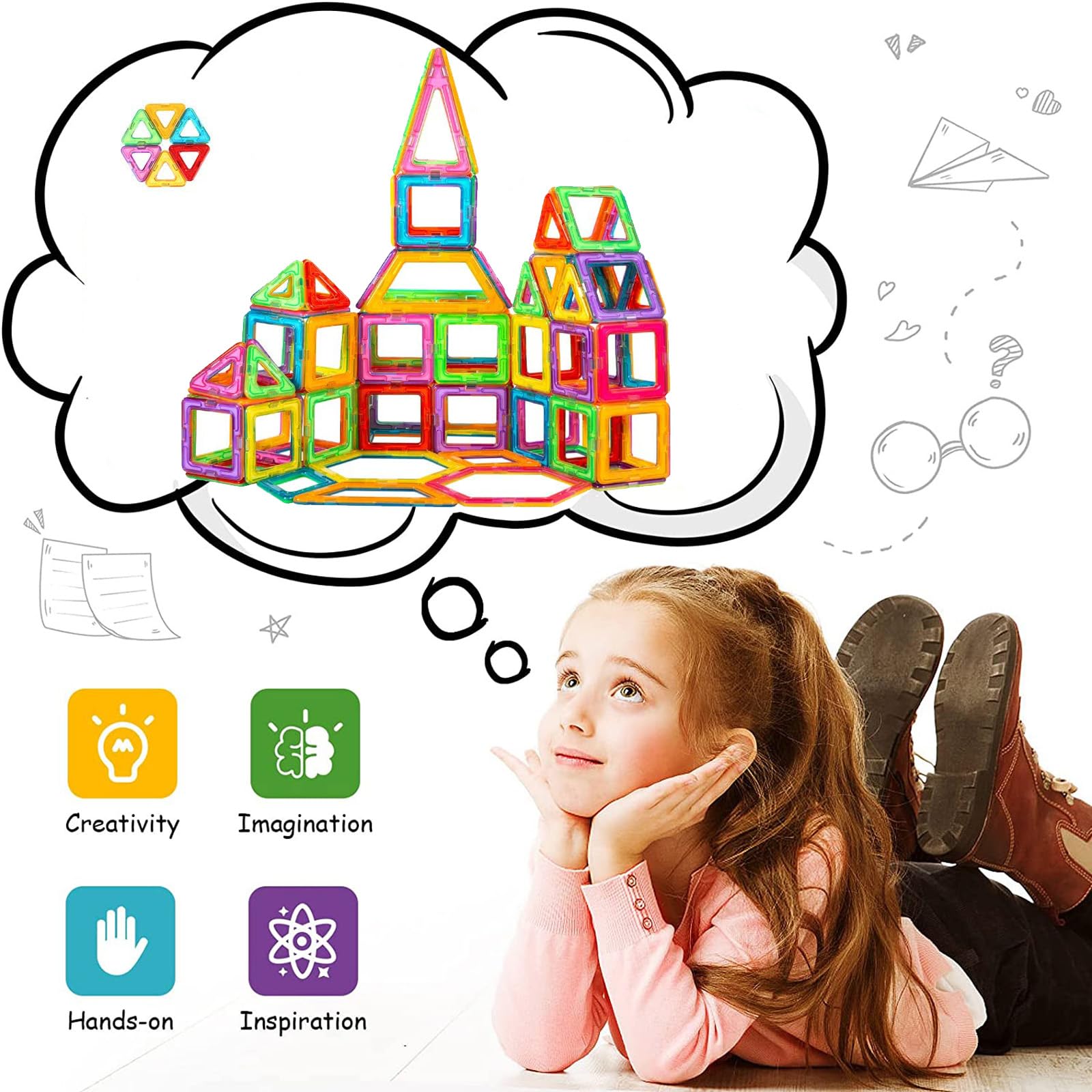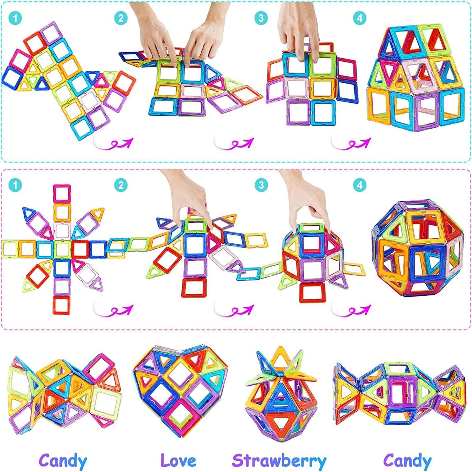 ["Magnetic blocks: Total of 76 pieces, including 50x triangles, 26x squares, 1x booklet. 2 different random colors on each side of each magnetic tile. Compatible with other tiles of similar size.", "Material for children: The magnetic blocks are PC material according to ce, astm-f9633 and en71. The smooth edge of each magnetic tile will never hurt the small hands and mouth of the baby.", "Educational and creative toy for toddlers: 76-piece toy set with magnetic blocks, a great creative toy for your child to unleash their imagination. It is low-tech and generates very little noise. Your child can develop their creative side and motor skills in a playful way, can be combined into many patterns like house, airplane, train, cat, fish, ball & more.", "Suitable for children 3 years and older: This building set promotes fine motor skills in toddlers and stimulates imagination and interest in science, technology, and design in older children. Best educational stacking sets for your boys and girls.", "Multiplayer toy: suitable for parents and children to play together, but also suitable for multiple children to play together, developing children's communication skills and teamwork through interaction."]
