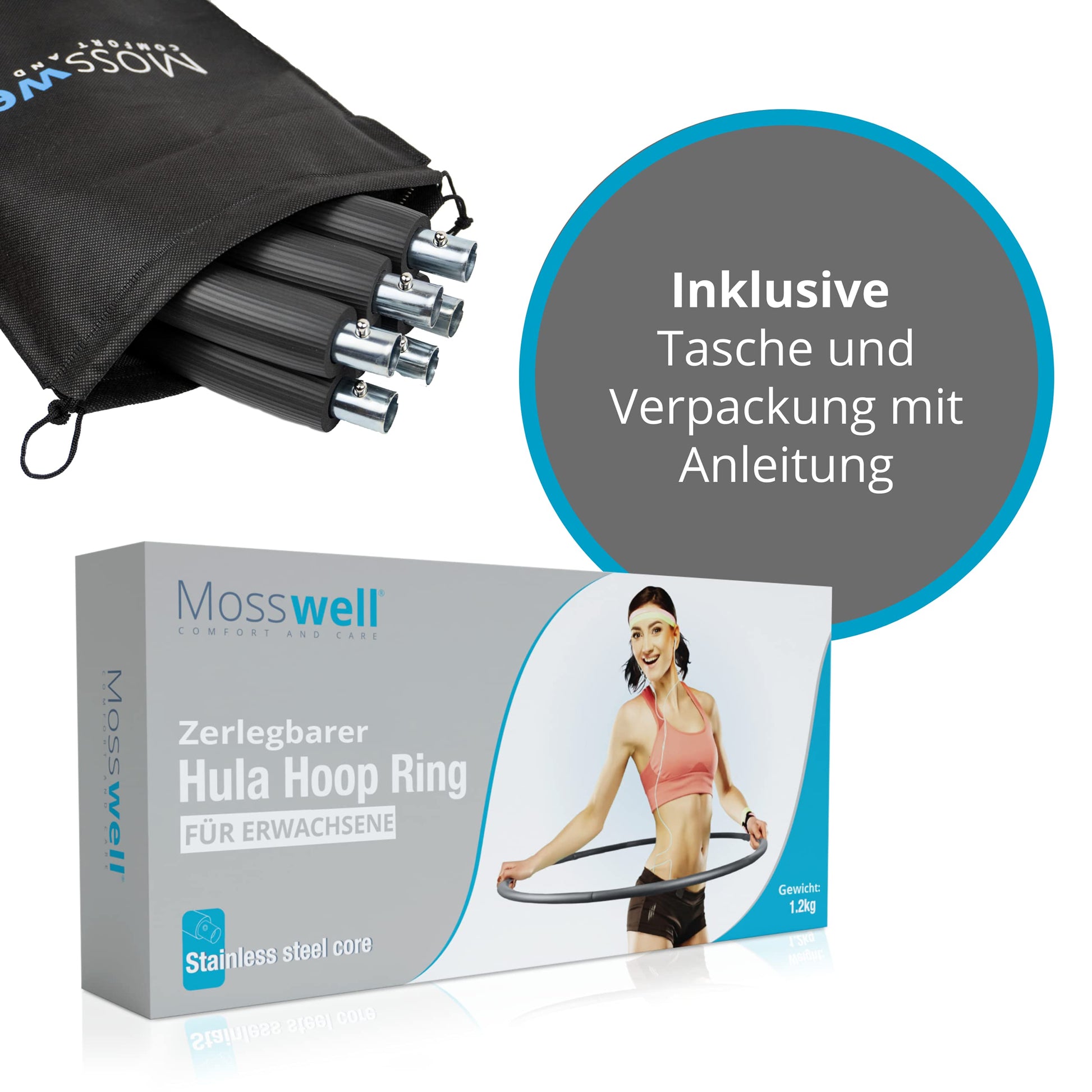 ["✅EFFECTIVE FULL BODY WORKOUT: The Mosswell Fitness-Hoop is perfect for a holistic body workout. Its smooth rotation, supported by a sturdy metal core, makes it the ideal training device for beginners and provides a fun way to achieve fitness goals.","✅BEGINNER FRIENDLY: This adult hula hoop is specially designed for beginners. With a weight of 2.64 lbs and a user-friendly structure, it offers the perfect balance between challenge and user-friendliness for beginners.","✅SPORTY DESIGN: Our sports hula hoop combines functionality with an appealing design. Not only is it effective for training, but it is also aesthetically pleasing, making it a motivating fitness companion.","✅FLEXIBLE TRAINING: This beginner hula hoop offers the opportunity to train at home or outdoors. Its lightweight design and included bag make it ideal for working out in the park or while traveling.","✅VERSATILE USAGE: The Mosswell Hula Hoop is more than just an exercise hula hoop; it is a versatile fitness device suitable for various types of training. Whether at home, in the gym, or outdoors - it is the perfect companion for an efficient and varied workout."]