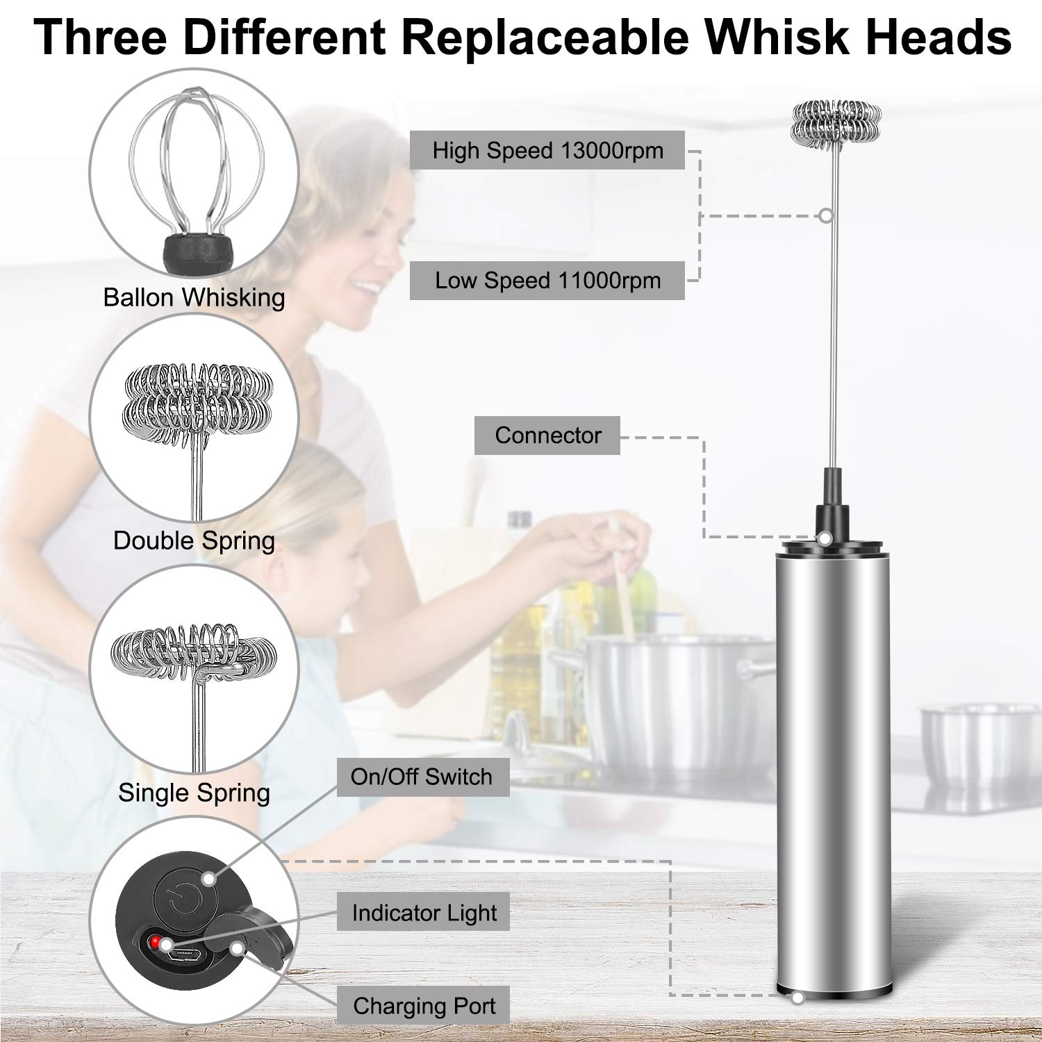 "【2-Speed Adjustable Milk Frother】2 different speed levels (the highest is very strong). Speed: Low speed (11000rpm) - High speed (13000rpm) - OFF. Choose the different speeds to achieve an ideal frothing effect, be sure to choose a large vessel.",