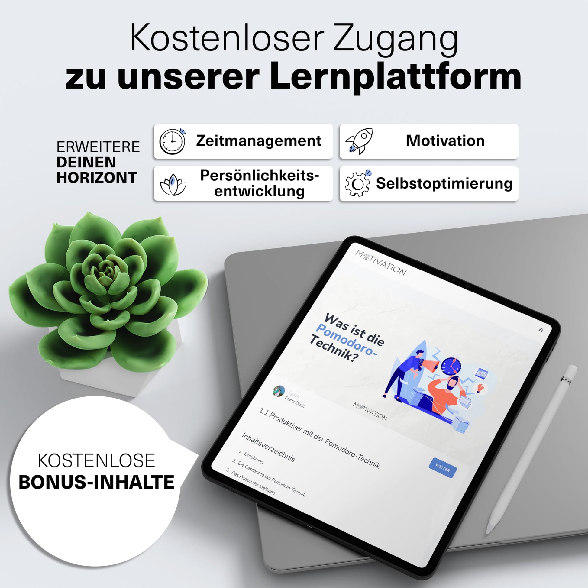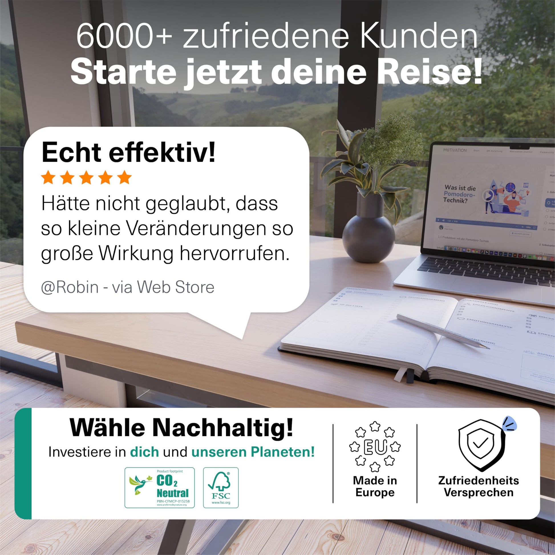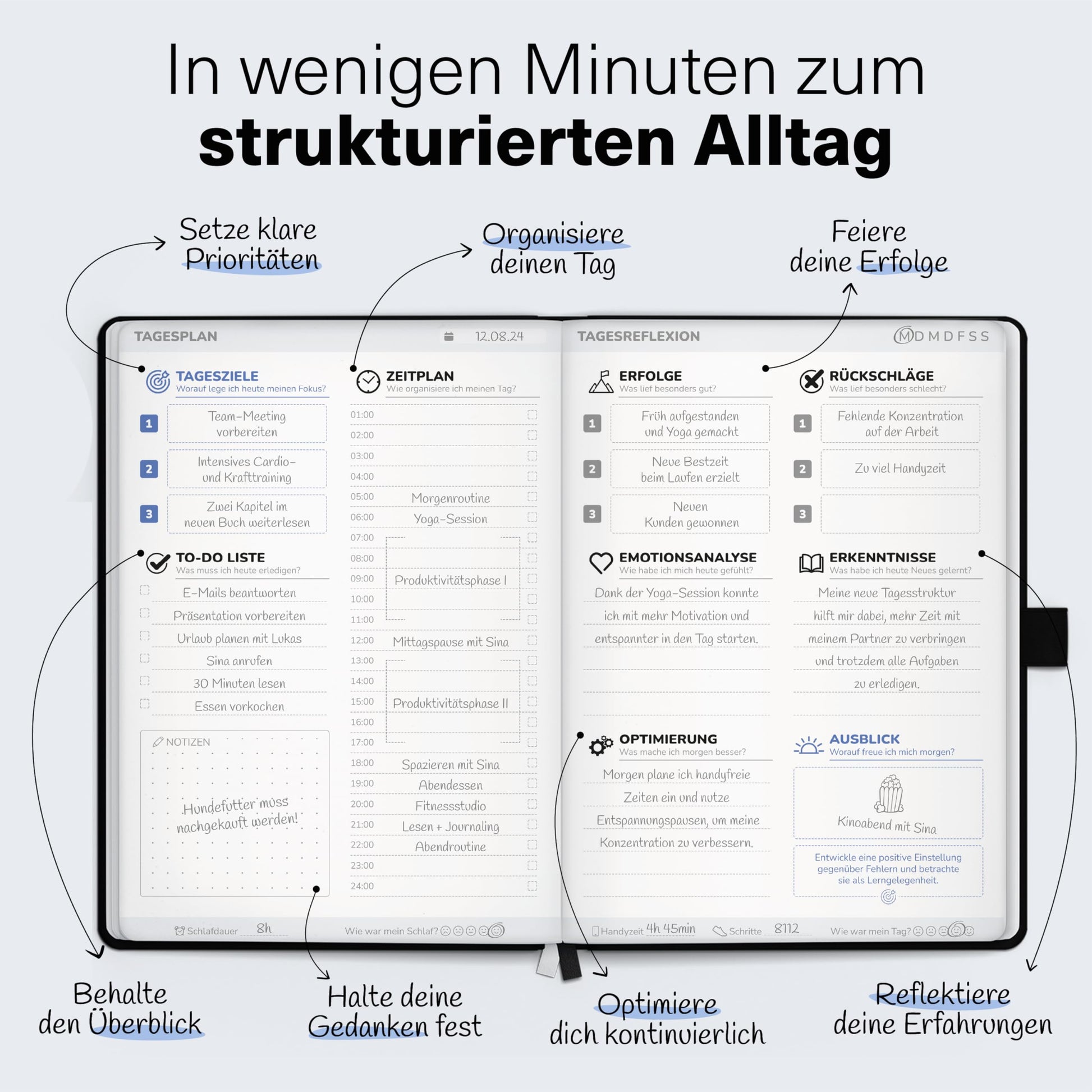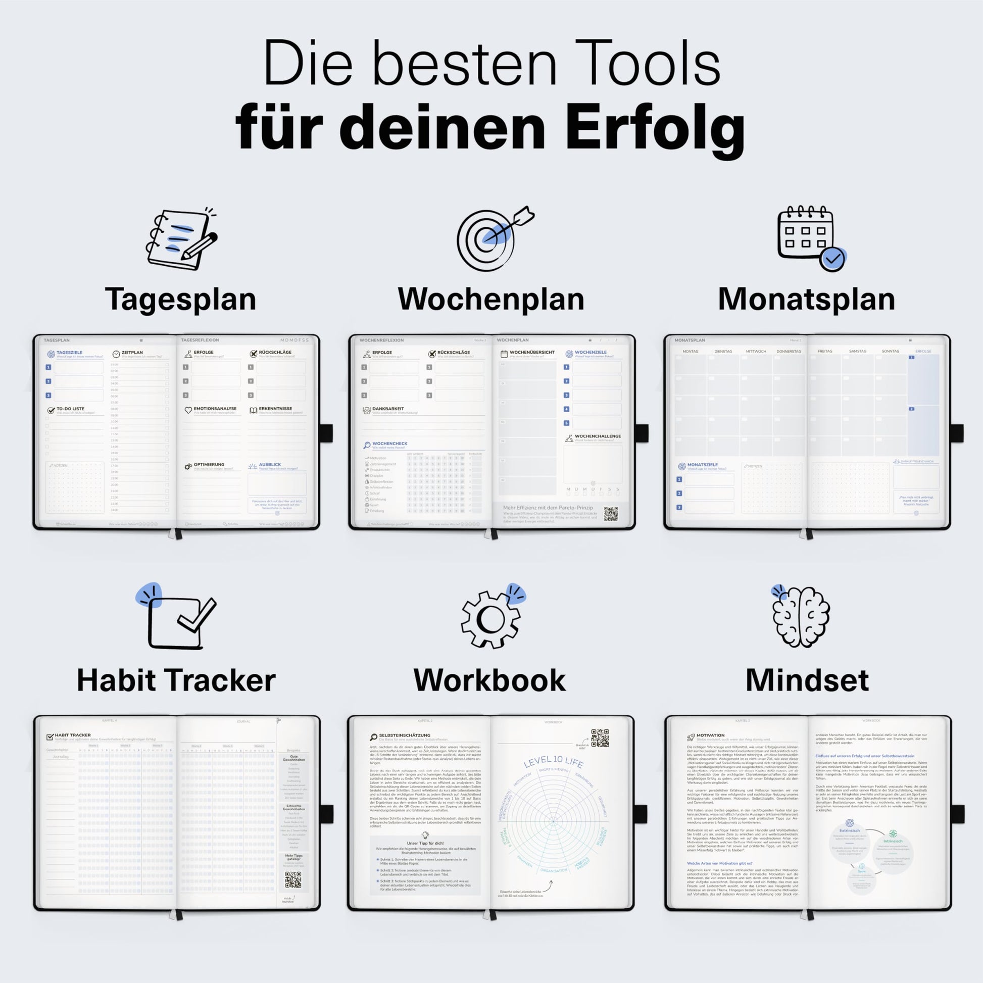 ["All-in-One Solution: The ultimate tool to plan your success. Our journal book is more than just a daily planner. It combines workbook, mindset tips, habit tracker & comprehensive journaling.","Master goals & personal development: Clearly define goals with your daily journal, break them down into sub-goals & achieve them through self-reflection. Deep analyses & valuable insights.","Organization & time management: Your key to perfect organization: YOUR personal organizer! Time boxing, comprehensive to-do lists, and clearly defined daily, weekly & monthly plans in one.","Clarity in just 6 minutes: Quick planning, maximum focus – optimize your daily routine for more productivity.","Learning platform: 15 exclusive video lessons await you! Improve your time management, strengthen your mindset, and ignite your motivation. Achieve goals in record time"]