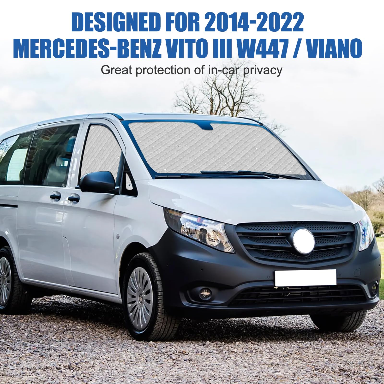 "Compatibility: Front windshield sunshade compatible with Mercedes-Benz VITO III W447 2014 2015 2016 2017 2018 2019 2020 2021 2022. Please check your car model before purchasing.