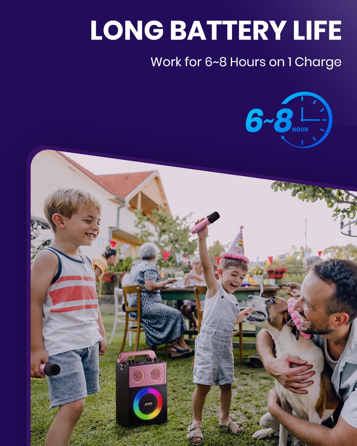 ["【🎤PREMIUM KARAOKE EXPERIENCE】1.5\" tweeter + 6.5\" woofer + 15W RMS power = Loud sound & excellent audio quality. The Moukey MPS4 Karaoke Machine has a larger woofer than other speakers of the same size, meaning you get clearer tones, better bass, less distortion, and higher cost efficiency.","【🎒PARTY ANYWHERE】Weighing only 3.3KG and featuring a durable 1.35M strap, the MPS4 Karaoke Machine can be easily carried, even by children. The speaker size is only 23.2x13.05x36.07cm, similar to a backpack. Children can bring it to camping, picnics, after school, and other small outdoor parties or events.","【😃FUN AND EASY TO USE】Each button has clear markings on the control panel, even children can easily understand and use it. The microphone buttons are also easy to use, users can press the "magic sound" button to change the output voice in 3 different styles and have more fun.","【🎸PLAY IN VARIOUS WAYS】This PA speaker is equipped with Bluetooth 5.3 and can be connected to most Bluetooth devices (such as phones, laptops, and tablets). Supports Micro TF card, USB, AUX IN, and FM radio. Instruments can be connected to the speaker through the "MIC IN" port.","【🔋PARTY ANYTIME】Moukey MPS4 Owl Eyes Karaoke Speaker supports over 2 hours of playtime. Along with a Type-C cable, the speaker and microphones can be charged in most cars with a 5V/1A charging port and can be used while charging. No more worries about battery life, just enjoy the party."]