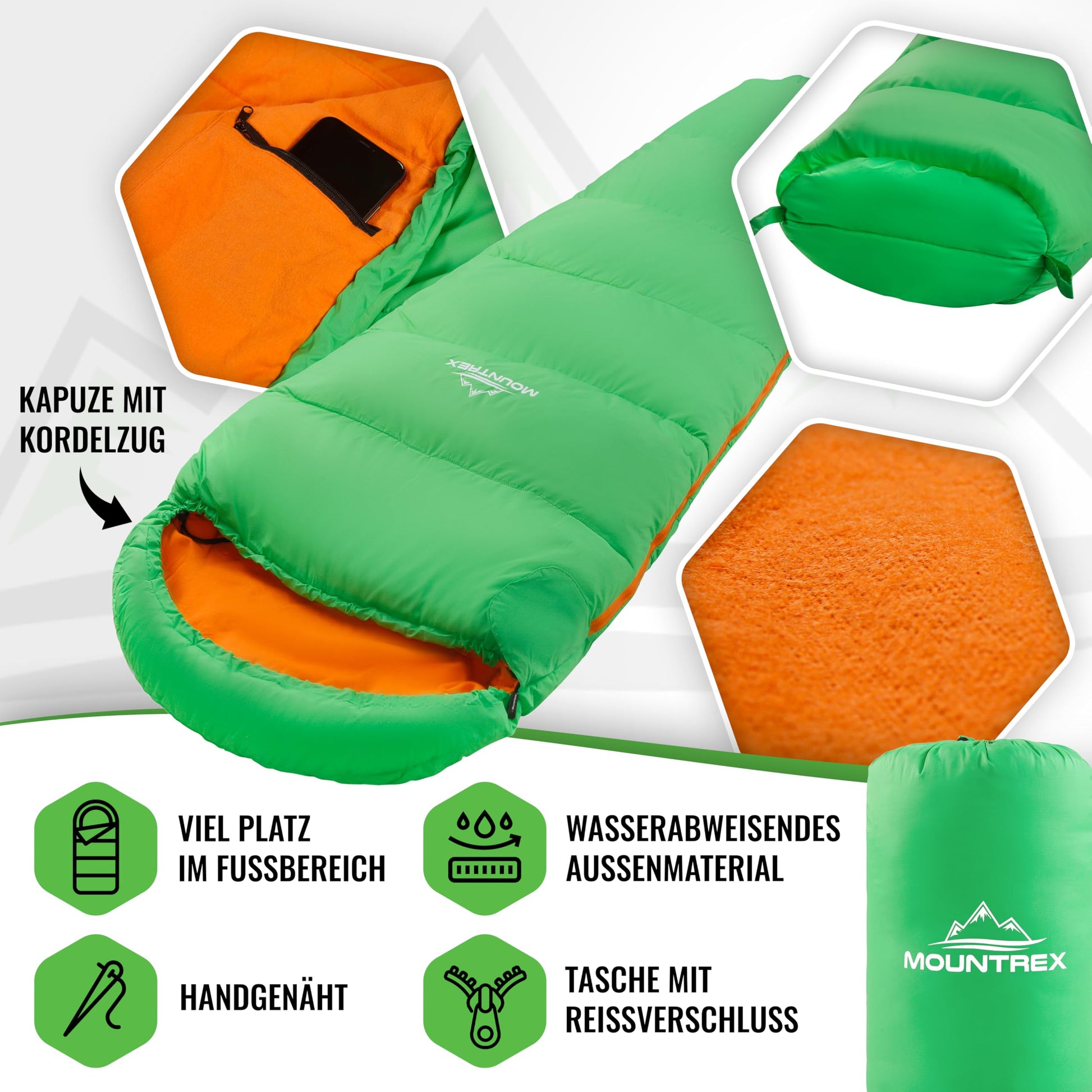 ["ποΈ PORTABLE LIKE A BACKPACK β Kids don't like to carry "baggage" in their hands. That's why we designed our children's sleeping bag to be easily carried like a backpack. This way, your child always has their hands free. Now with extra reinforced shoulder straps.", "ποΈ 100% COTTON β Normal children's sleeping bags are made of polyester and don't offer much comfort. The MOUNTREX children's sleeping bag, on the other hand, has a soft cotton flannel lining that is soft, cozy, and warm. Sleeping like in their own bed!", "ποΈ CHILD-FRIENDLY ZIPPER β The special resin zipper is more flexible than regular metal zippers and is easier to open & close. Additionally, the zipper is designed in a way that the fabric doesn't easily get caught or jammed.", "ποΈ LIGHT & COZY & WARM β The outer fabric is made of high-quality 300T nylon, making the children's sleeping bag soft, warm, and lightweight. The material is also "crinkle-free", there is hardly any rustling noise like you would hear from polyester sleeping bags.", "ποΈ HAND-SEWN β Our children's sleeping bags are hand-sewn. This guarantees high-quality and precise seams, more accurate than with cheap machine production. The children's sleeping bag is ideal for camping, traveling, school outings, picnics in the garden."]