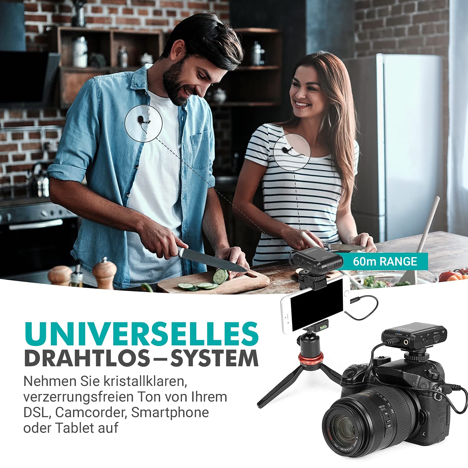 ["UNIVERSAL WIRELESS SYSTEM: Capture crystal clear, distortion-free audio from your DSLR, camcorder, smartphone, or tablet. Perfect for filmmakers, vloggers, mobile journalists, and content creators","RELIABLE AUDIO: Features an enhanced RF chipset that operates on the open 2.4GHz frequency spectrum, providing interference-free wireless transmission up to 60m (200 ft)","1 YEAR WARRANTY: We've got you covered! Our products are designed to alleviate your technical woes, not worsen them. Our friendly US support team is here for you","CONVENIENT: With the headphone jack, you can monitor your audio material in real-time to ensure accurate sound recording. Adjust the microphone volume for more control and save time in post-production. Each device is powered by two 'AAA' batteries for up to 6 hours of operation","IN THE BOX: Includes a transmitter with belt clip, a receiver with belt clip and shoe mount, a lavalier microphone, a 3.5mm TRS cable for cameras, a 3.5mm TRRS cable for smartphones and tablets, as well as a hardshell case"]