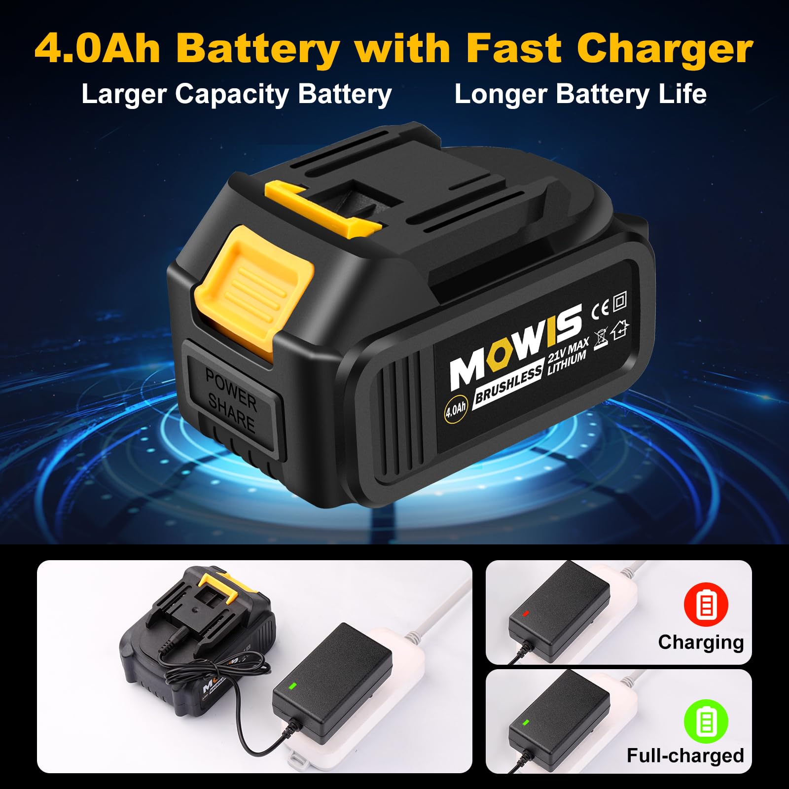 4.0Ah Battery & Brushless Motor *** The MOWIS impact wrench is equipped with a 4.0Ah lithium battery and a brushless motor, extending the battery life by 50%. It provides stronger power to keep the tool running continuously and maximize efficiency.