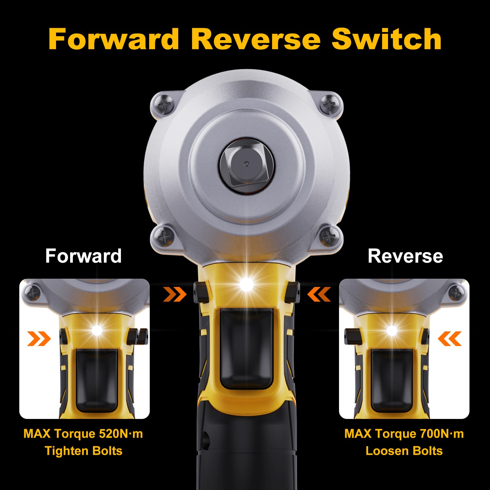 "700N.m High Torque *** MOWIS impact wrench delivers 7000Nm breakaway torque and 600Nm tightening torque. You can adjust the speed of the brushless impact wrench by the pressure you apply on the trigger.