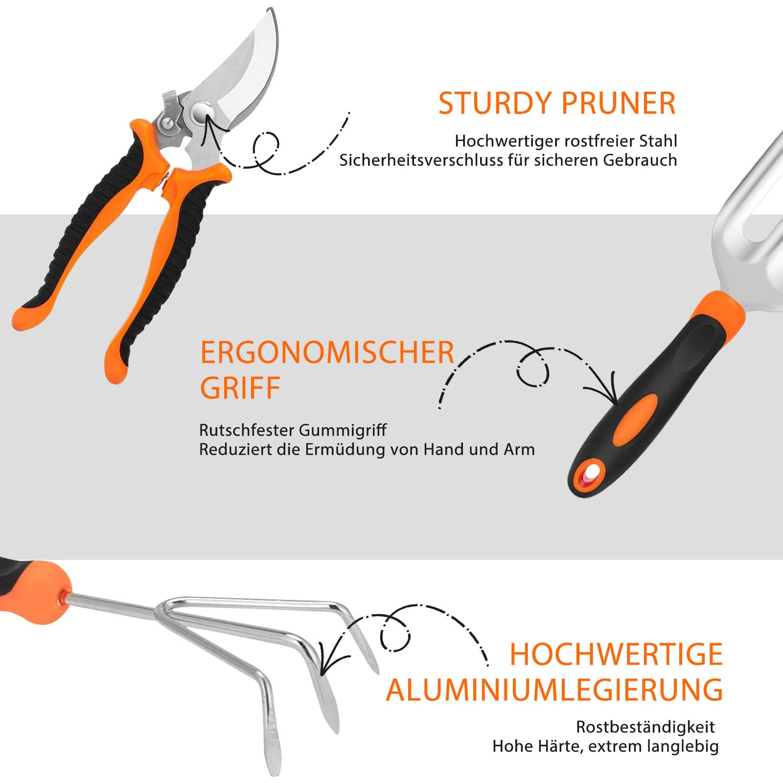 Ergonomic Handle Design: Each piece in this garden tools set features an ergonomic handle design. Comfortable to hold. This reduces the strain on your hands and wrists during extended use.