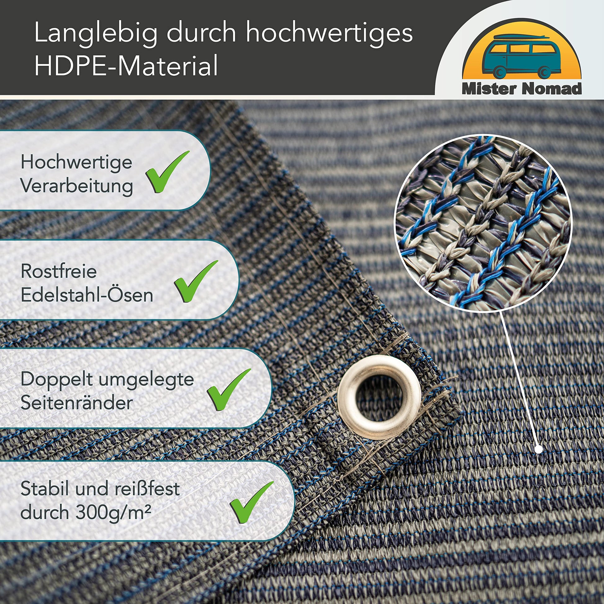 Mr. Nomad awning carpet 2x2.5m - High-quality, UV-resistant camping carpet made of HDPE (300 g/m²) - Perfect awning floor for caravans & motorhomes - includes carrying bag & accessories