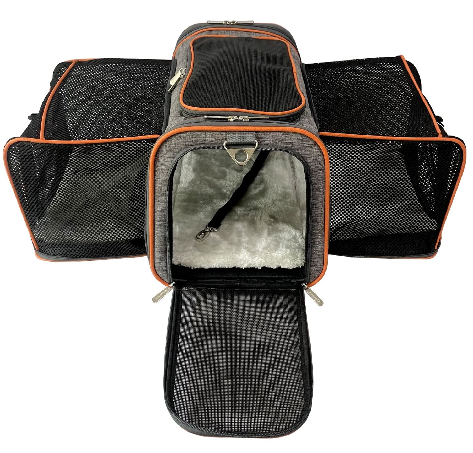 ["Expandable pet carrier approved by airlines: 18 inches length x 10.5 inches width x 11 inches height, suitable for pets up to approximately 15 inches length x 9 inches height and up to 15 pounds. Airline-approved carriers are designed for pets to lie down, so your cat or dog may not be able to stand. Designed with a ventilated roof and meets all airline compatibility regulations for under-seat storage, including Delta, Southwest, United, American, Virgin, and others","Airline requirements: I collaborate with representatives from different airlines in designing all of my airline carriers. Always remember that each airline sets its own specific regulations, which may even vary between their domestic, international, and shuttle routes, so it is always recommended to inquire with your airline of choice. All require your pet to be comfortably contained in the carrier and remain under the seat in front of you. All prefer a soft carrier for its flexibility.","Two-tone charcoal ash wood fabric - easy to clean with a wipe, waterproof, and comes with a plush interior fleece padding that is both comfortable and easy to clean (hand wash or dry clean recommended). Carrier folds down to less than 3 inches when not in use","Sturdy and lightweight - Designed with breathable mesh for good ventilation. Removable plush fleece bedding, padded shoulder strap. The shoulder strap design has been tested and rated for up to 40 lbs of dynamic load, making this model best suited for pets under 15 lbs. The snowflake nylon material is so durable and strong, it is also used in the construction of military-grade parachutes."]