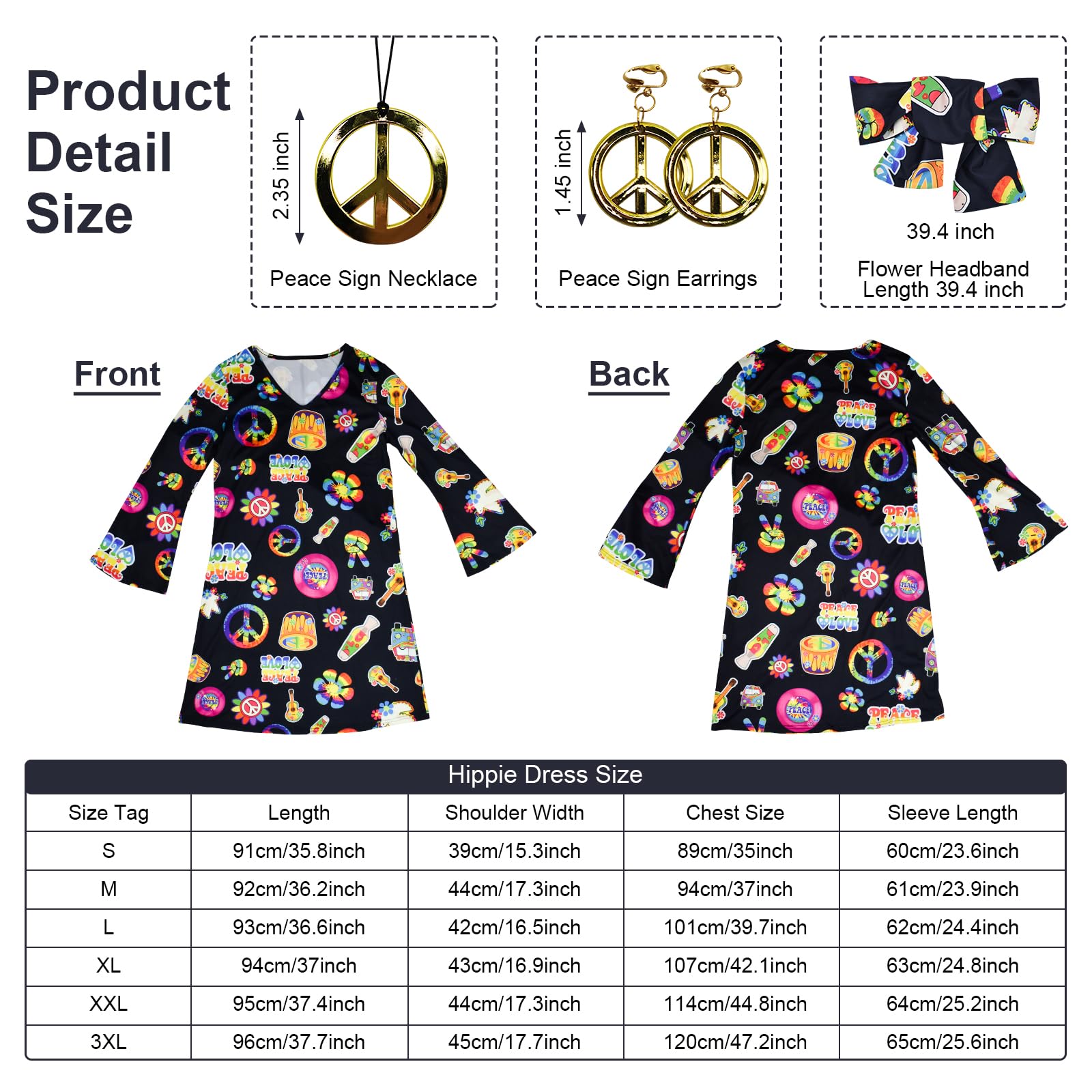 ["Included: 6-piece Hippie costume set with accessories: 1 Hippie dress, 1 Cosplay sunglasses, 1 headband, 1 necklace with Peace sign, and 1 pair of earrings with Peace sign. The perfect outfit for retro parties of the 60s, 70s, and 80s. You deserve it.", "Comfortable Material: The Hippie Disco dress is made of Polyester and Elastane. It is soft, stretchy, light, and breathable, so you can feel comfortable and show off your curves. The necklace and earrings are made of high-quality plastic in the shape of a Peace sign. They look charming and convey a sense of love and peace.", "Beautiful Vintage Design: Dress with vibrant colors and flared sleeves, vintage paisley print, boho flower pattern, full of sophistication and elegance. You will look enchanting at the great parties.", "Various Occasions: Perfect for Halloween, Carnival, 60s, 70s, and 80s parties, Hippie Disco party, masquerade, prom, retro costume contest, nightclub, live action role-playing party, wedding, 70th birthday, theater performance, Woodstock party, class reunion, Christmas party. You will stand out from the crowd.", "Size Information: Please check the exact measurements in the size chart before purchasing."]