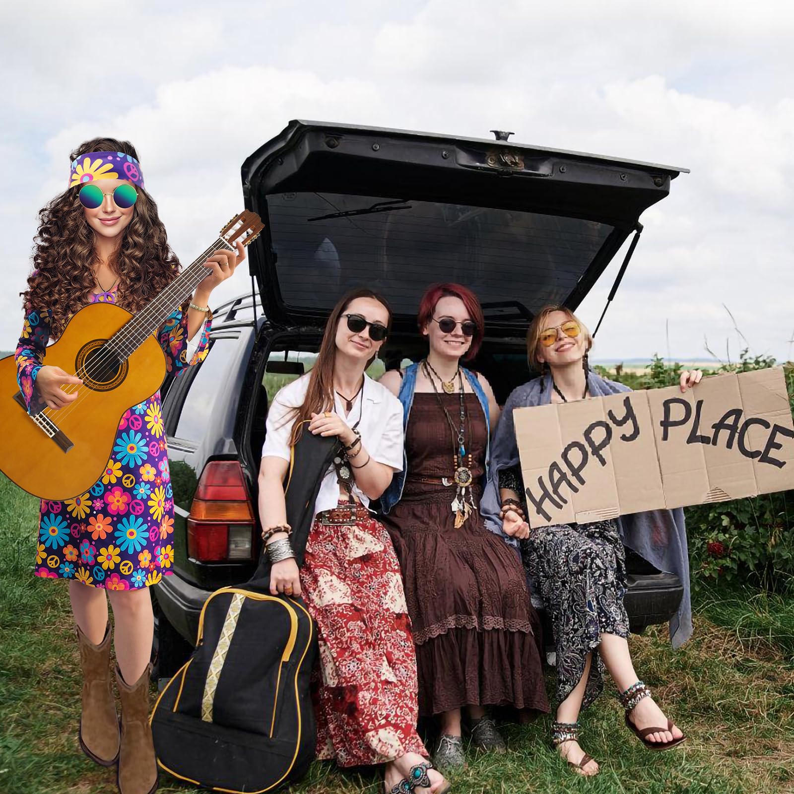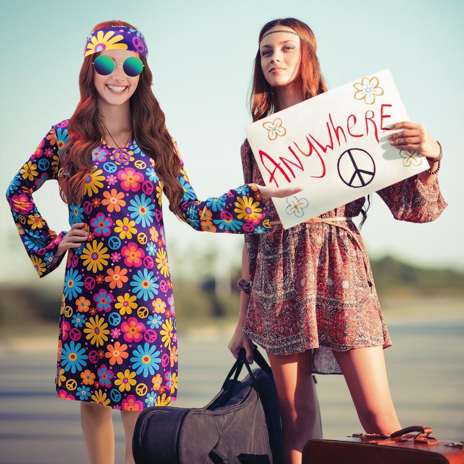 ["Included: 6-piece Hippie costume set with accessories: 1 Hippie dress, 1 cosplay sunglasses, 1 headband, 1 Peace sign necklace, and 1 pair of Peace sign earrings. The perfect outfit for retro parties from the 60s, 70s, and 80s. You deserve it.","Comfortable material: The Hippie Disco dress is made of 96% polyester and 4% elastane. It is soft, stretchy, lightweight, and breathable to make you feel comfortable and show off your curves. The necklace and earrings are made of high-quality plastic and are in the shape of a Peace sign. They look charming and convey a sense of love and peace.","Beautiful vintage design: Vibrant colors of the dress with long flared sleeves and vintage paisley prints, Boho floral patterns, sophisticated and elegant. You will look charming at 60s and 70s Hippie Disco themed parties.","Suitable for many occasions: Perfect for Halloween parades, Carnival, costume parties, Hippie Disco parties, masquerade, prom, retro costume contest, nightclub, costume role-playing party, anniversary, 70th birthday, Woodstock, class reunions, cruise holidays, decades, Christmas party, and more. It will make you shine brighter in the crowd.","Size information: Please check the exact measurements in the size chart before purchasing. -"]