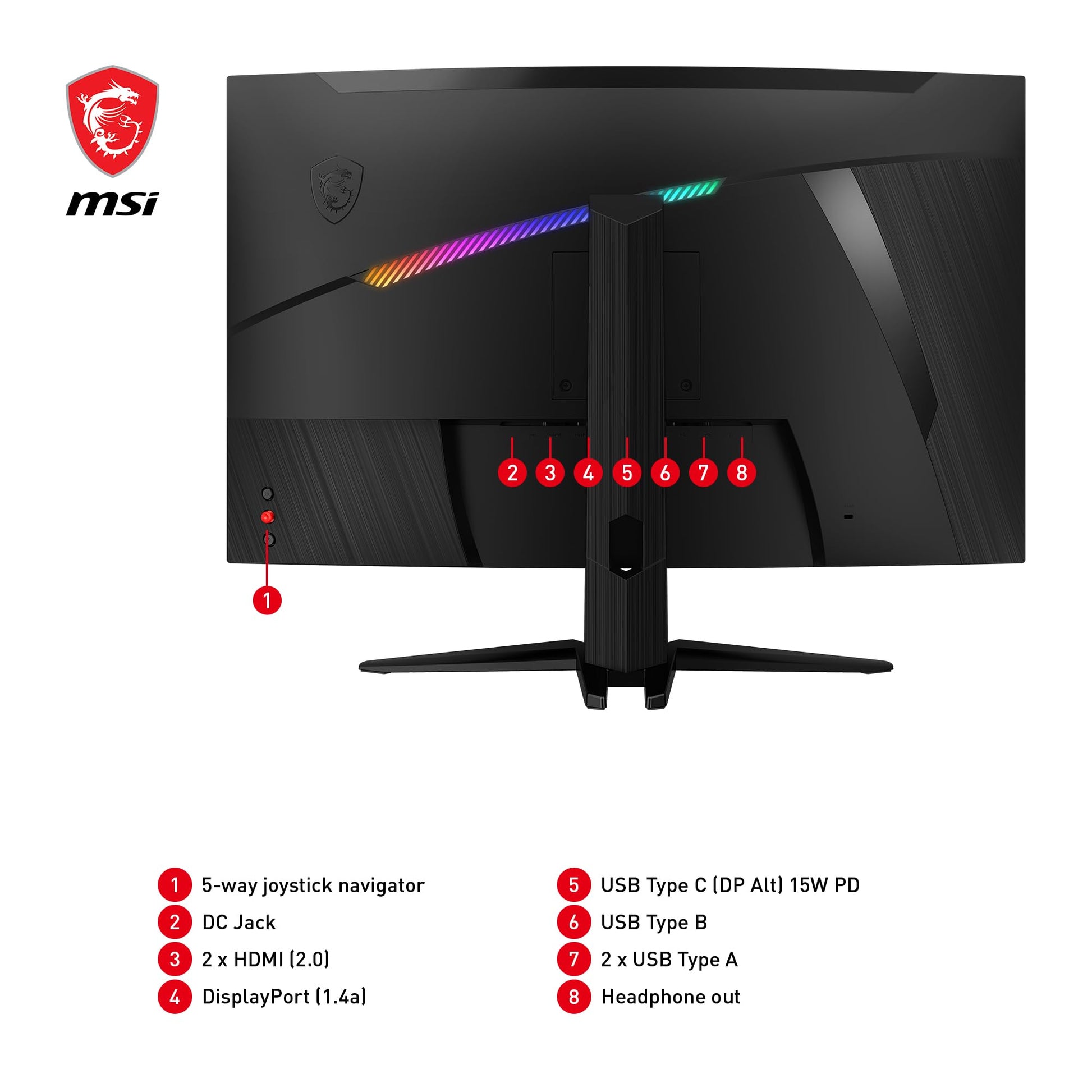 VERSATILE CONNECTIVITY - Video interface options include DisplayPort 1.4a and USB Type-C (WQHD/240Hz), HDMI 2.0 ports (WQHD/144Hz); rear connections: USB 2.0 Type-A and -C, headphone output, and 5-way adjustable joystick navigator."