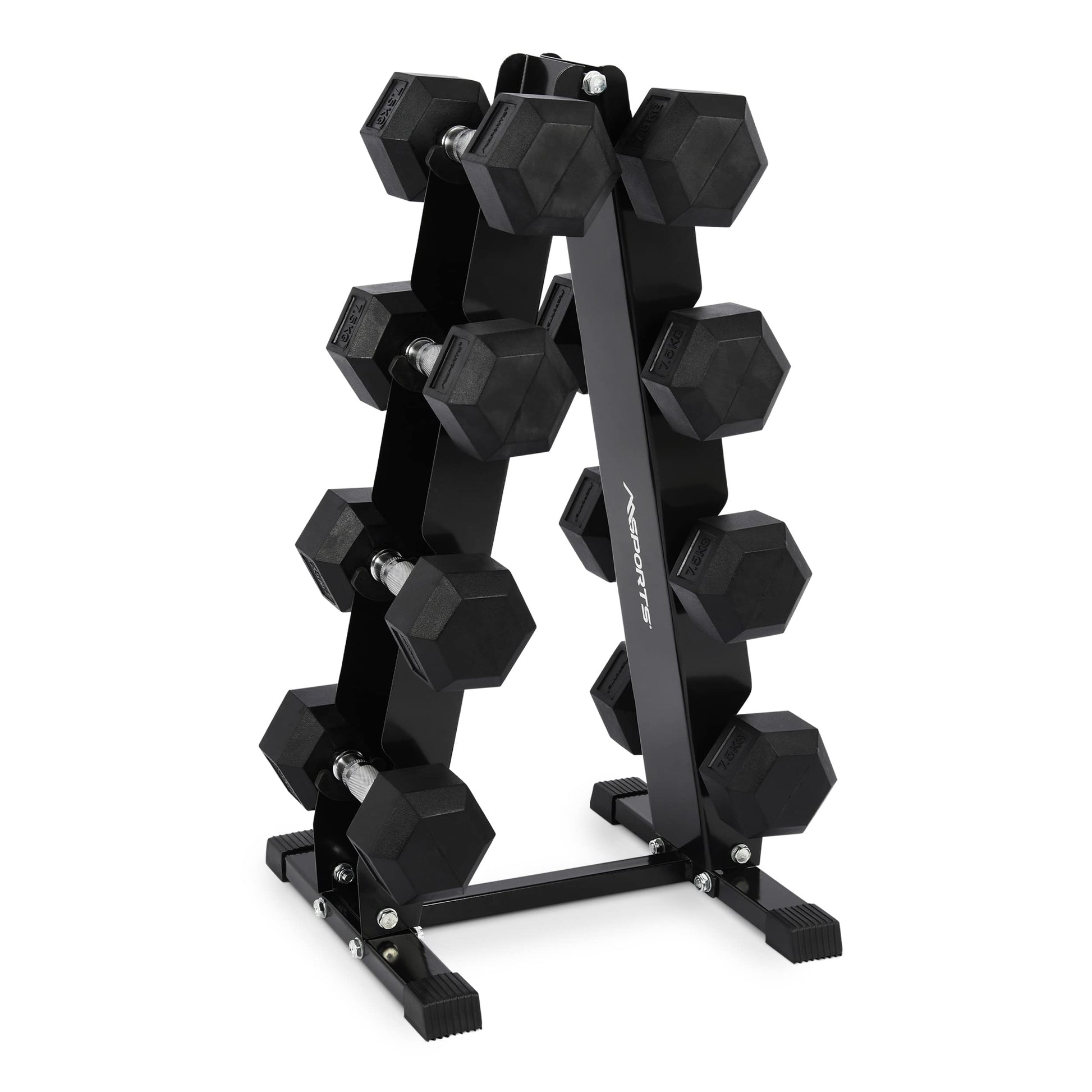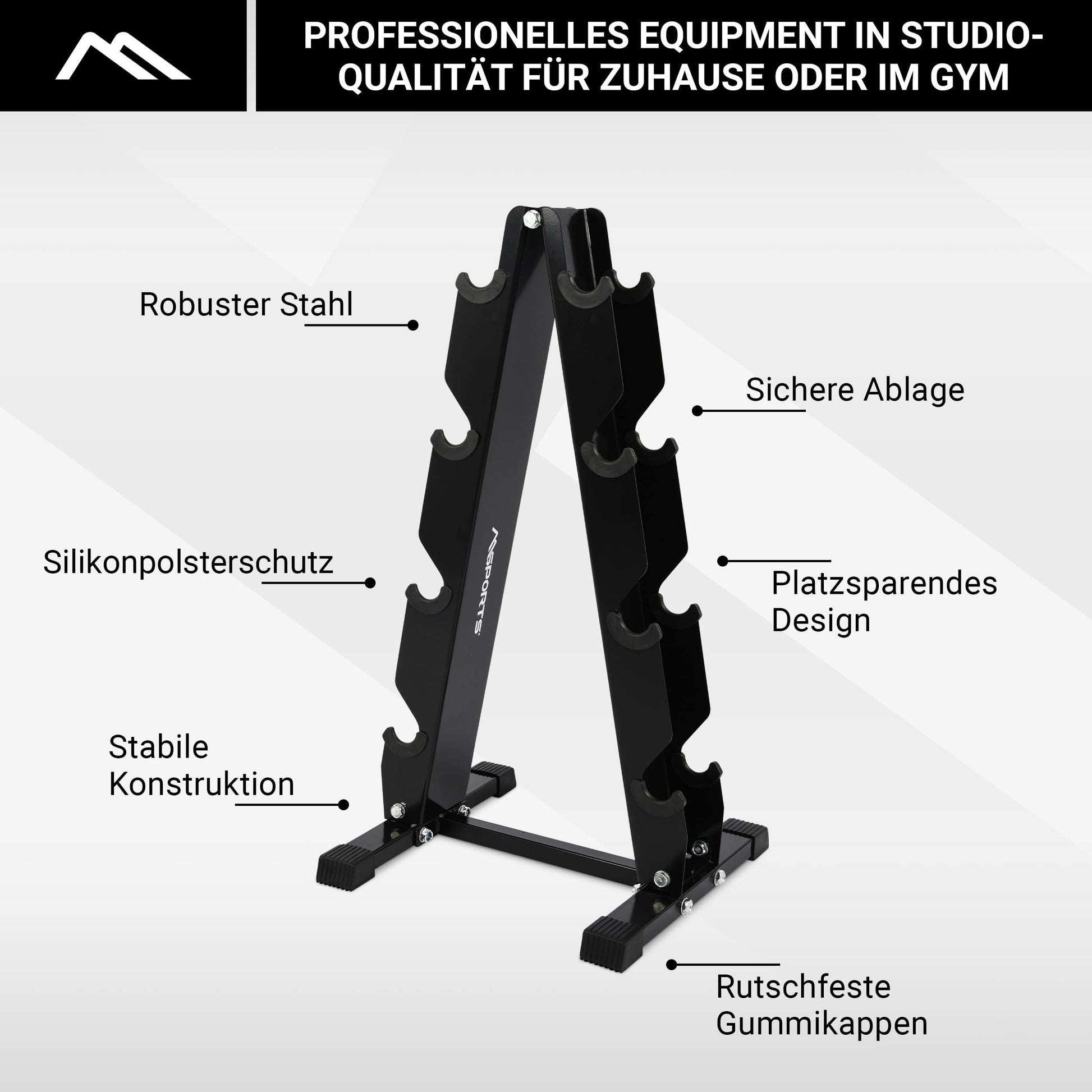 ["MSPORTS Dumbbell Rack - Suitable for PROFESSIONAL use in the studio or for home training. With the dumbbell rack, you are PERFECTLY equipped.","BRAND QUALITY - The solid dumbbell stand is HIGH-QUALITY PROCESSED and thus perfectly suitable for storing the dumbbells. Made of high-quality materials - Extremely resistant. Guarantees SAFE training.","PROTECTION - Rubber feet protect the floor from scratches.","STORAGE SPACE - 8 shelves suitable for dumbbells with a handle size of at least 12 cm.","DATA AND SHIPPING - Scope of delivery: 1x MSPORTS Dumbbell Rack | Material: Made of high-quality steel | Dimensions: L/W/H 43/40/80 cm | Color: Black | SHIPPING - With parcel service, not to a packing station, as it is too large."]