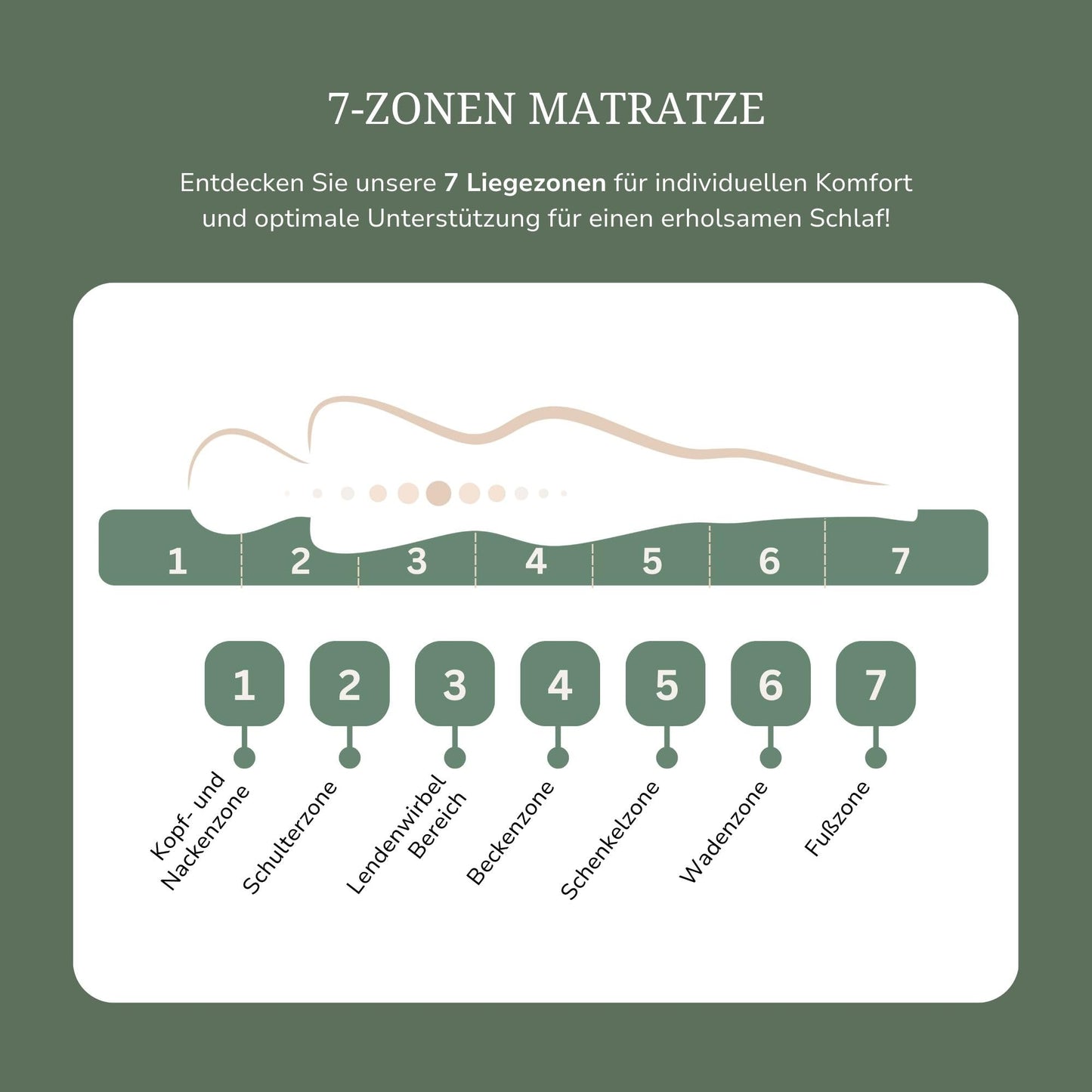 "Ergonomic sleeping surface: The 7-zone technology of our pocket spring mattress supports each body region precisely and therefore ensures an optimal sleeping position at all times, whether you sleep on your side, back, or stomach."