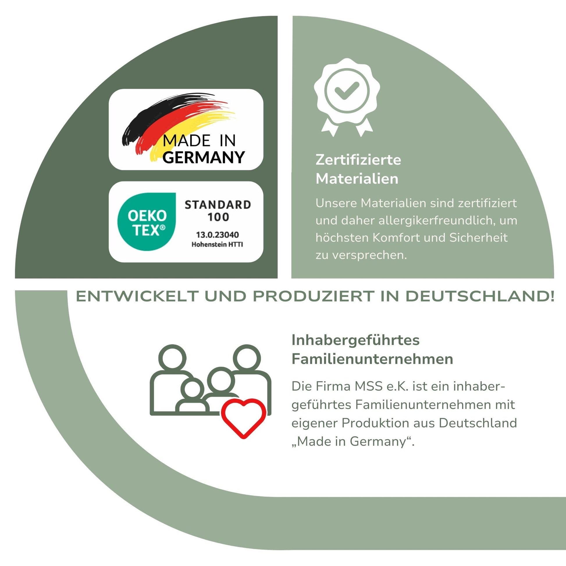 "Made in Germany: Our premium pocket spring mattresses are produced with great care and expertise in the heart of Germany. To ensure the maximum safety of our products, our pocket spring mattresses are STANDARD 100 by OEKO-TEX (13.0.23040 HOHENSTEIN HTTI) certified."