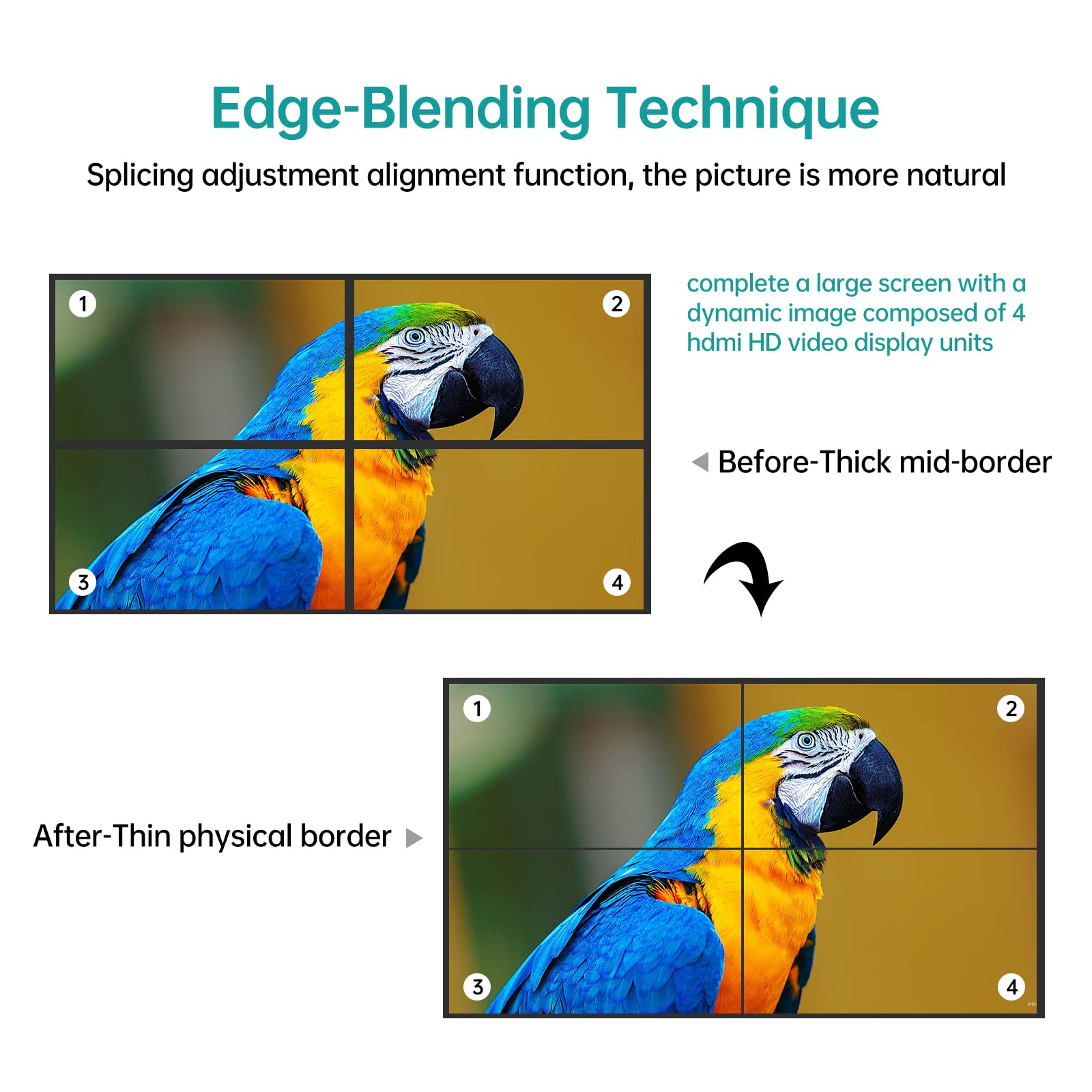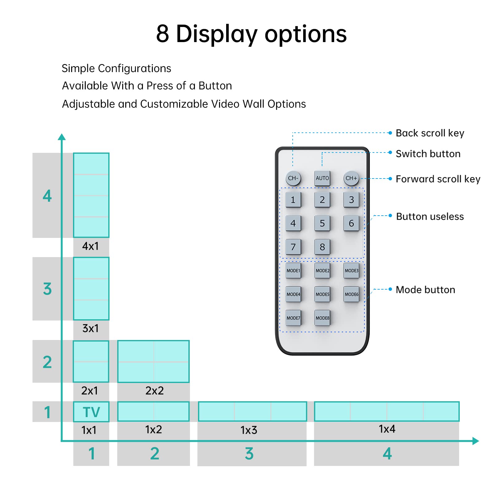 MT-VIKI 2x2 HDMI Video Wall Controller 2x2 Quad Splicer Screen Splitter 1 in 4 Out supports 8 display modes 2x2, 1x2, 1x3, 1x4, 2x1, 3x1, 4x1 30 Hz