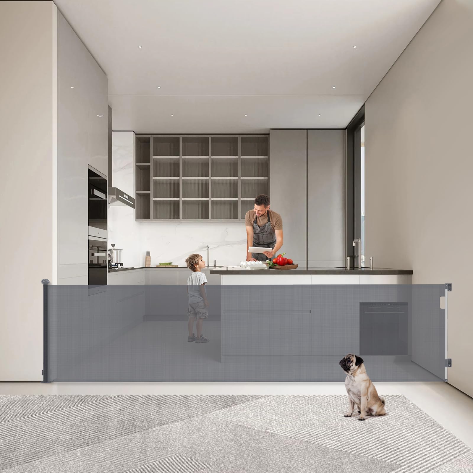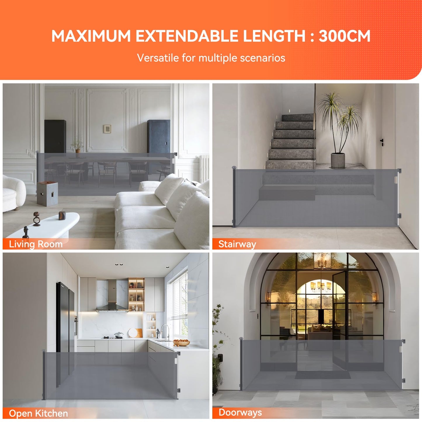 ["Excellent retractable design"] This retractable door guard is 0 to 300 CM wide and 89 CM high. When not in use, the gate can be easily stored in a space-saving way. Unlike iron gate bars, this retractable baby gate does not have a bottom rail, eliminating the risk of tripping.