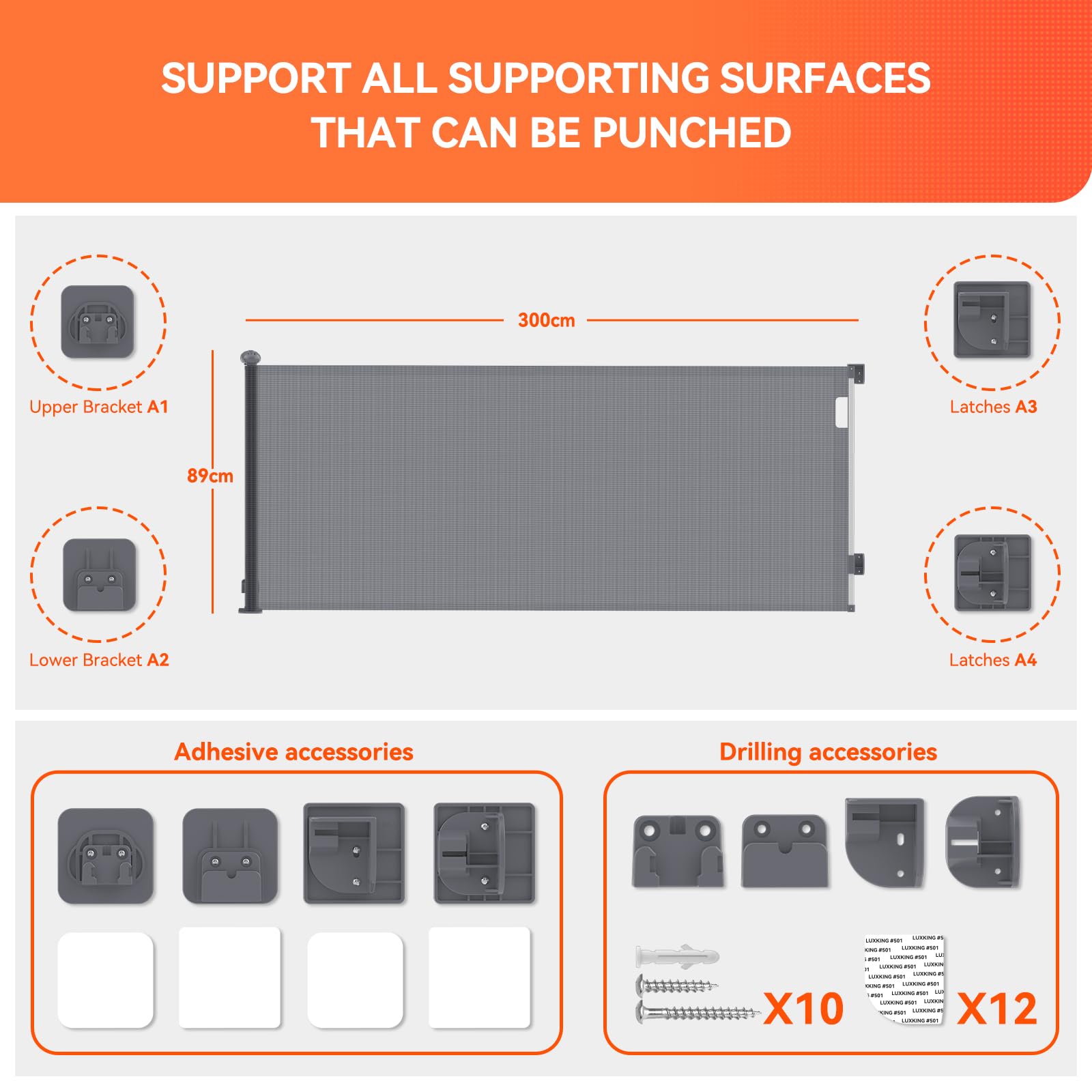 ["Suitable for babies and pets"] Baby gates can be used in restricted areas such as kitchens, bedrooms, stairs, living rooms, etc., to provide a safe environment for babies and pets. The mesh is made of strong and soft material (for safety reasons, we only offer accessories that need to be punched to withstand stronger impacts on the door rail).