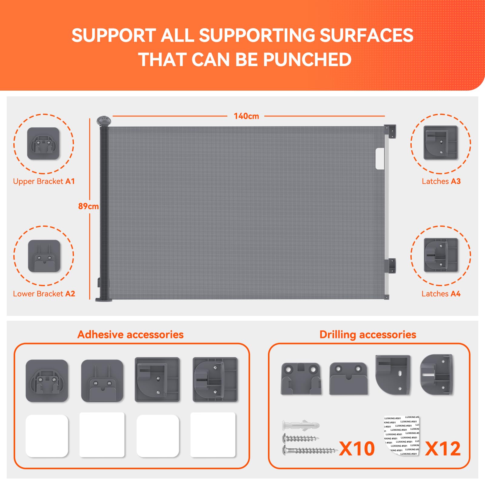 【Suitable for Babies and Pets】 Baby gates can be used in restricted areas such as kitchens, bedrooms, stairs, living rooms, etc. to provide a safe environment for babies and pets. The net is made of strong and soft material (for safety reasons, we only offer accessories that need to be punched to make the door rail withstand stronger impacts)."