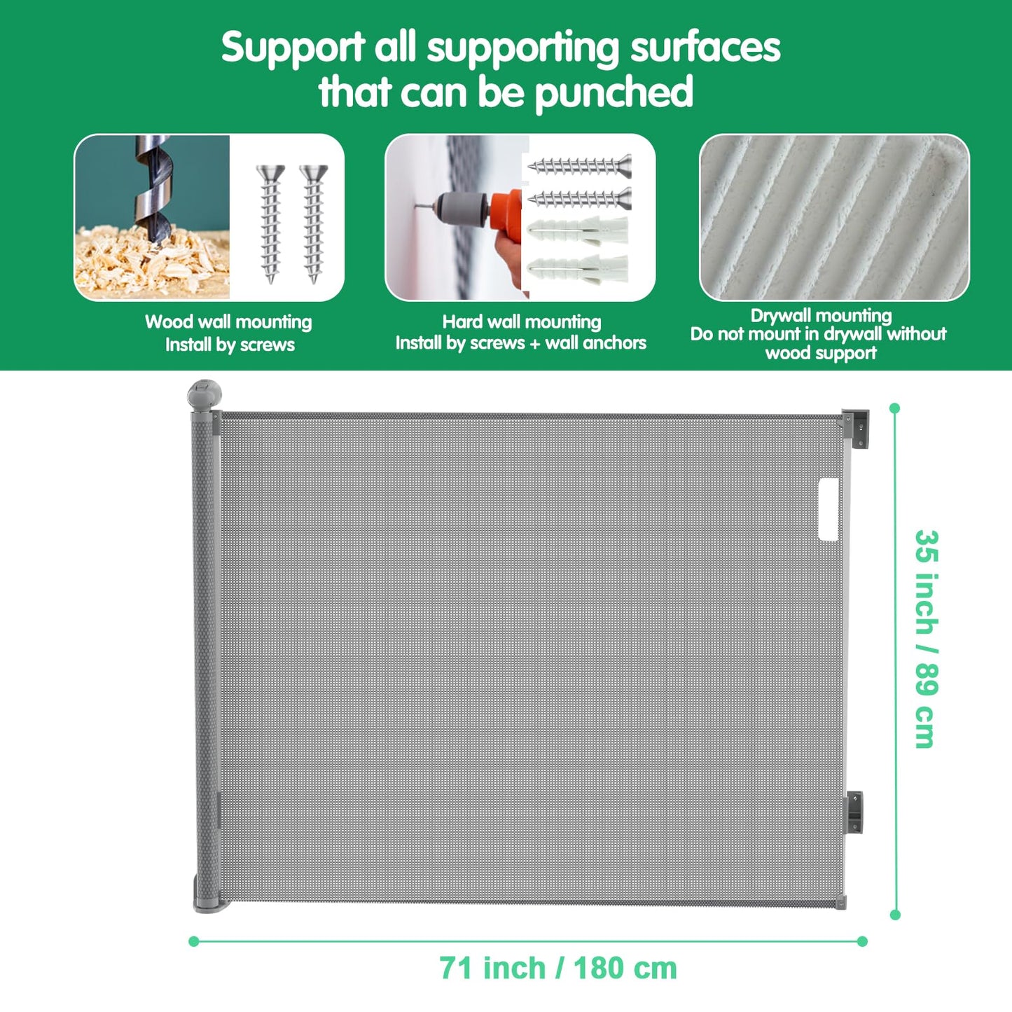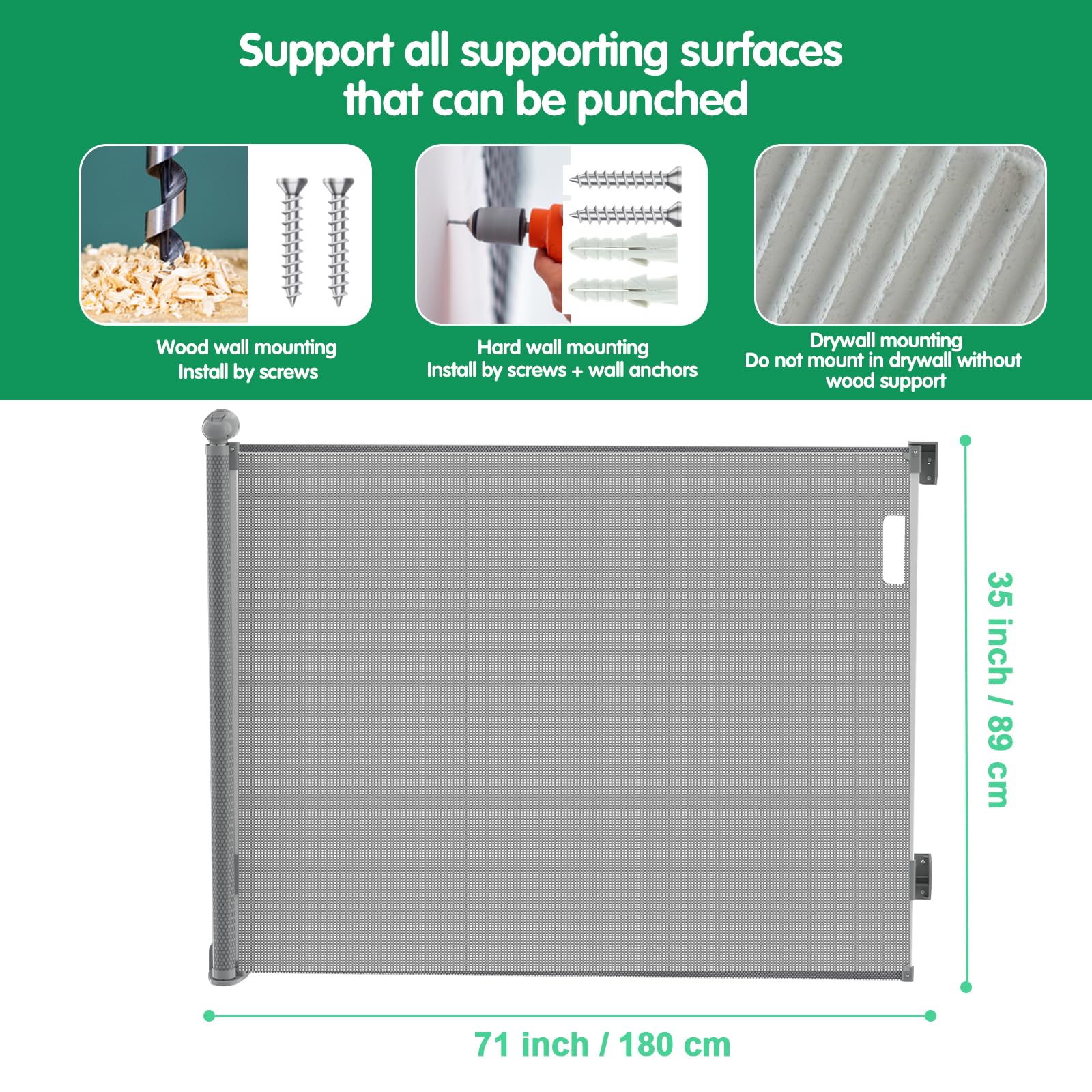 ["Suitable for babies and pets"] Baby gates can be used in restricted areas such as kitchens, bedrooms, stairs, living rooms, etc., to provide a safe environment for babies and pets. The mesh is a strong and soft material (for safety reasons, we only provide accessories that need to be punched so that the door rail can withstand stronger impacts).
