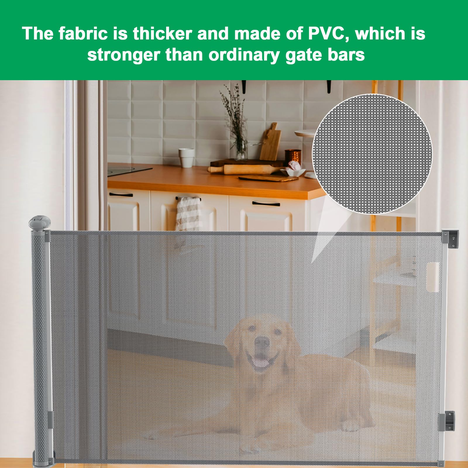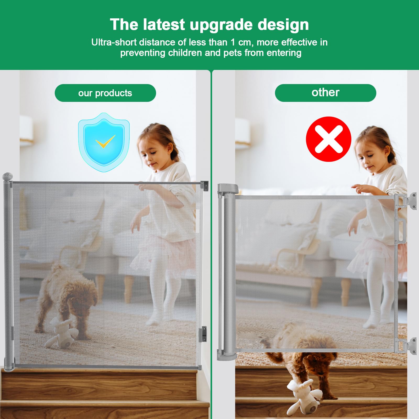["Excellent retractable design"] This retractable door guard is 0 to 70.8 inches wide and 35 inches high. When not in use, the gate can be easily and compactly stored. Unlike iron gate bars, this retractable baby stair gate does not have a bottom rail, eliminating tripping hazards.