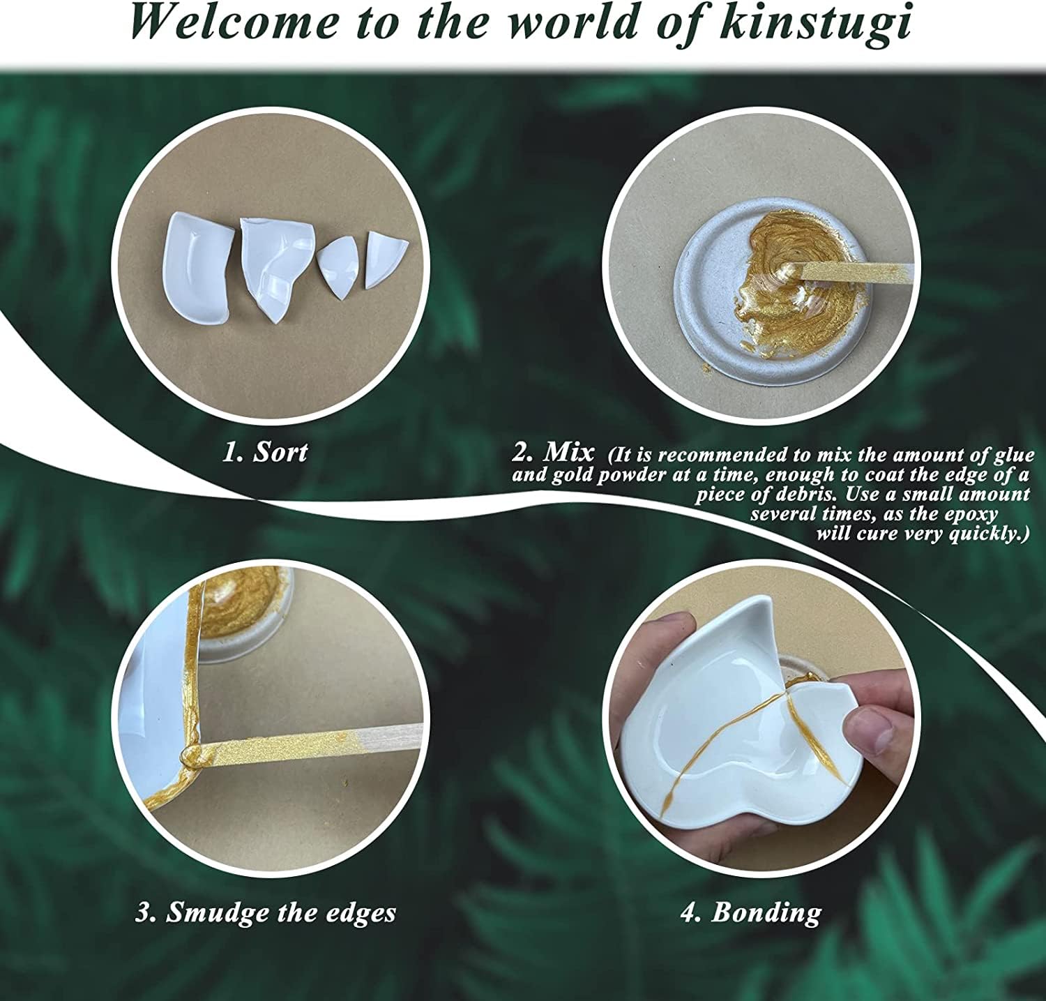 "Quick and easy Kintsugi repair kit: Mix Kintsugi adhesive and gold powder until well blended, then apply Kintsugi adhesive to the parts and stick them together. After using the Kintsugi adhesive, close the lid and it can be used again next time. Dishwasher safe after restoration. Note: The curing time of gold adhesive after mixing is about 5 to 10 minutes."