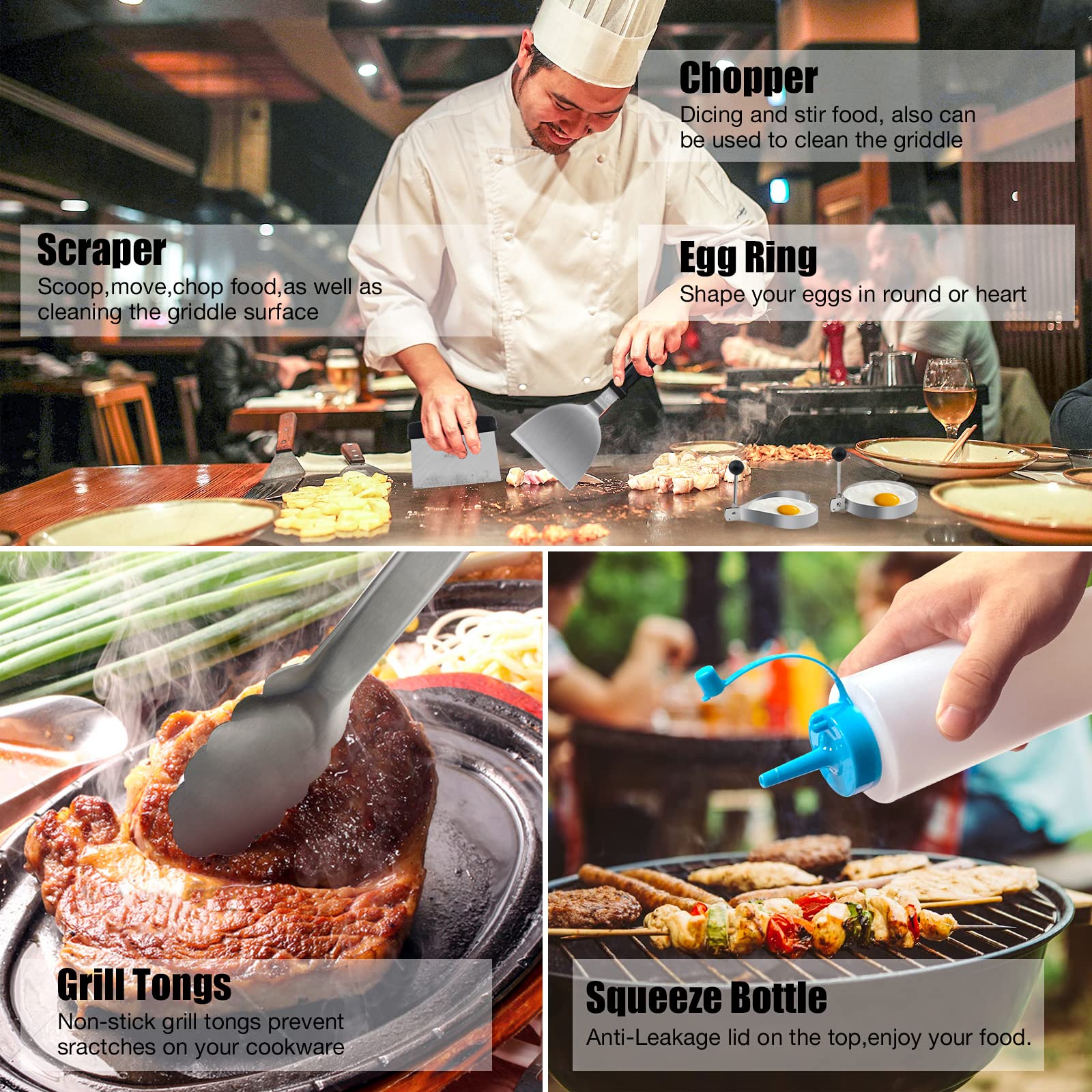 MUJUZE Grill Spatula Set includes 2 oversized long spatulas, 1 hamburger flipper, 1 scraper, 1 griddle spatula chopper, 1 grill apron, 2 egg rings, 2 squeeze bottles, 1 tongs, 1 silicone brush, and 1 cleaning brush. All plancha spatula accessories are stored in the MUJUZE handbag, which is very convenient to carry!
