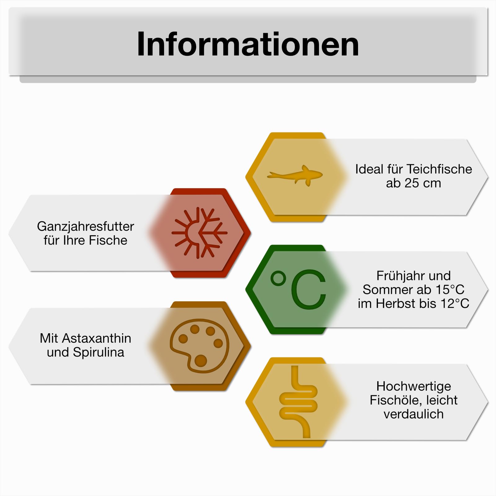 ["High-quality feed mix made from four different types of fish pellets","Easily digestible food with high-quality fish oils for improved nutrient absorption and minimized water pollution","Contains Astaxanthin and Spirulina to enhance vibrant colors","All-year-round feed for Koi and pond fish with balanced nutrients for good condition and natural coloration","Made in Germany"]