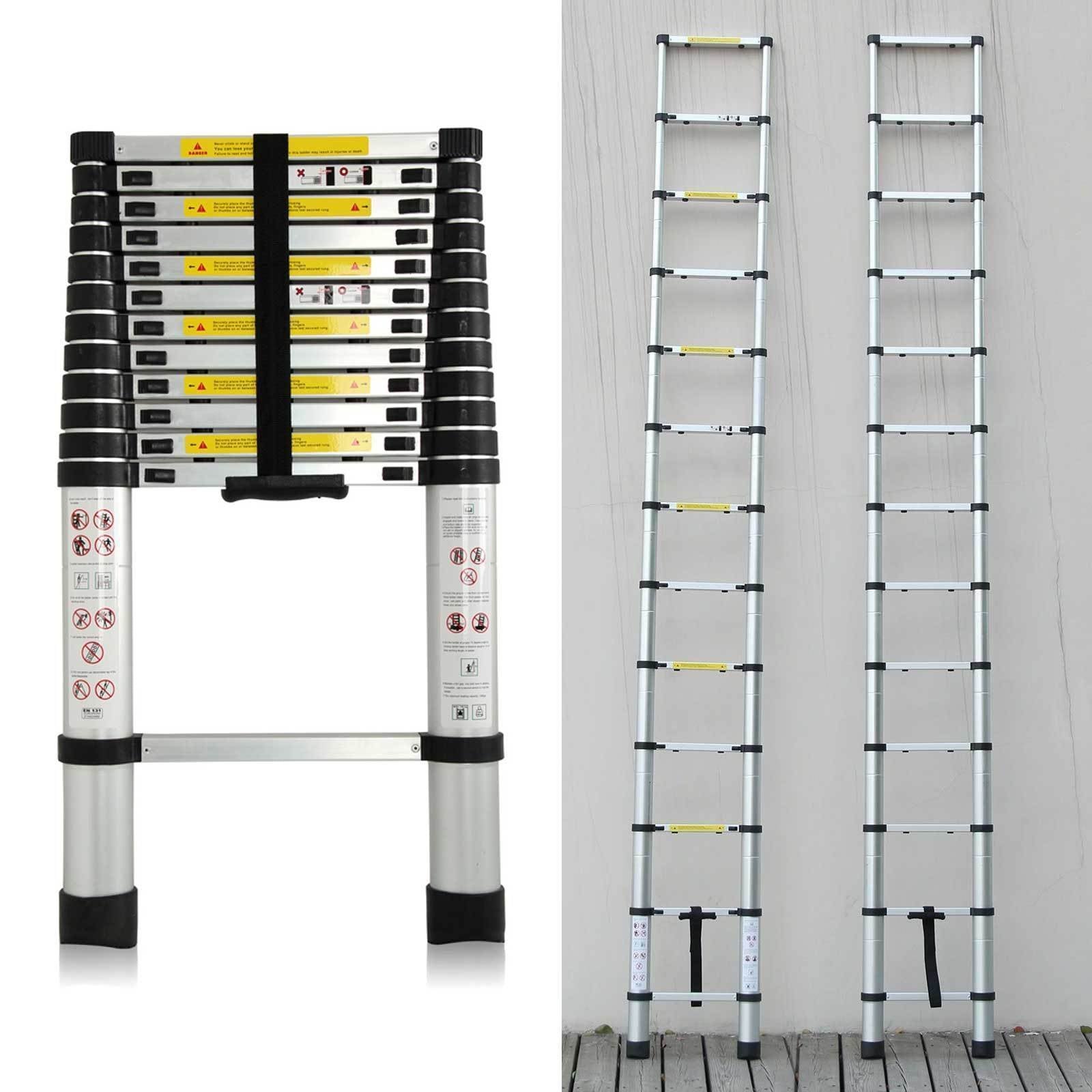 ["3.8m extendable telescopic ladder with 13 steps, maximum load up to 150 kg, safe for user to reach any high place","High-quality aluminum telescopic ladder, very convenient to use and easy to carry, a great helper for indoor and outdoor use","Safe and compact - black non-slip rubber sleeve at the bottom of the ladder step and multiple rubbers between two adjacent steps to avoid shocks and friction","Locking levels with locking mechanism Approved by the European safety standard EN131","Great helper for indoor and outdoor use, ideal for commercial use and DIY, e.g. for house/building maintenance, window cleaning, decorating outdoor and indoor areas, painting, etc."]