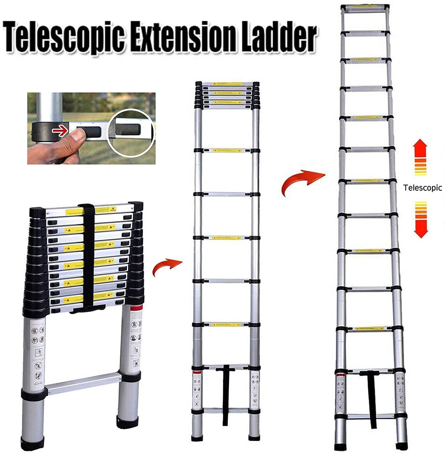 ["5m extendable telescopic ladder with 13 steps, maximum load up to 150 kg, safe for the user to reach any high place","High-quality aluminum telescopic ladder, very easy to operate and carry freely, a great helper for both indoor home use and outdoor activities","Safe and compact - black non-slip rubber sleeve on the bottom of the ladder step and multiple rubbers between two adjacent steps to avoid shocks and friction","Locking levels with locking mechanism. Approved by the European safety standard EN131","Great helper for both indoor home use and outdoor activities, ideal for both commercial use and DIY, such as house/building maintenance, window cleaning, outdoor/indoor decoration, painting, etc."]