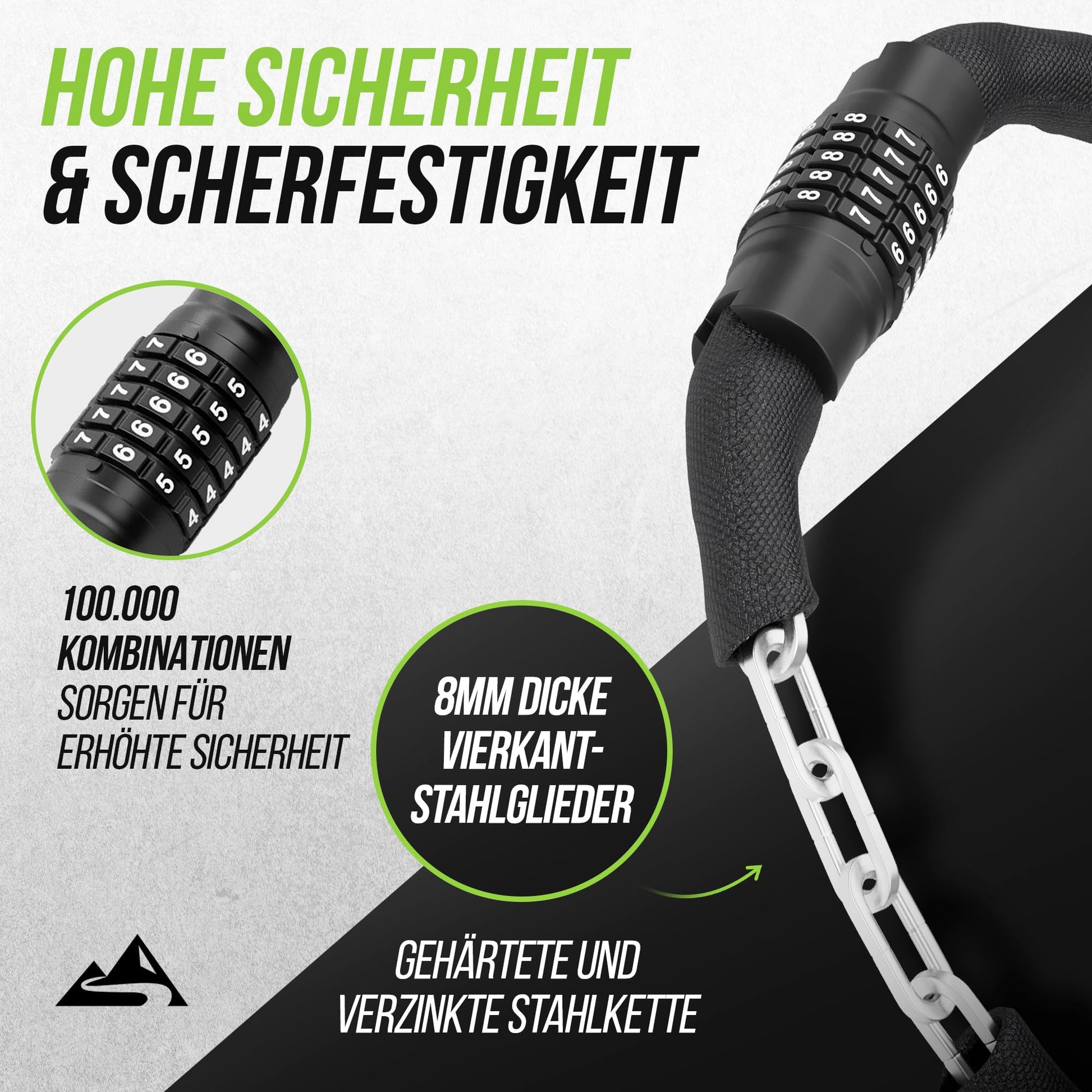 "ULTIMATE THEFT PROTECTION - Our bicycle lock with combination code provides maximum security for your bike, e-bike, scooter, or e-scooter. Thanks to the 8mm thick square chain, our bike combination lock offers high security.